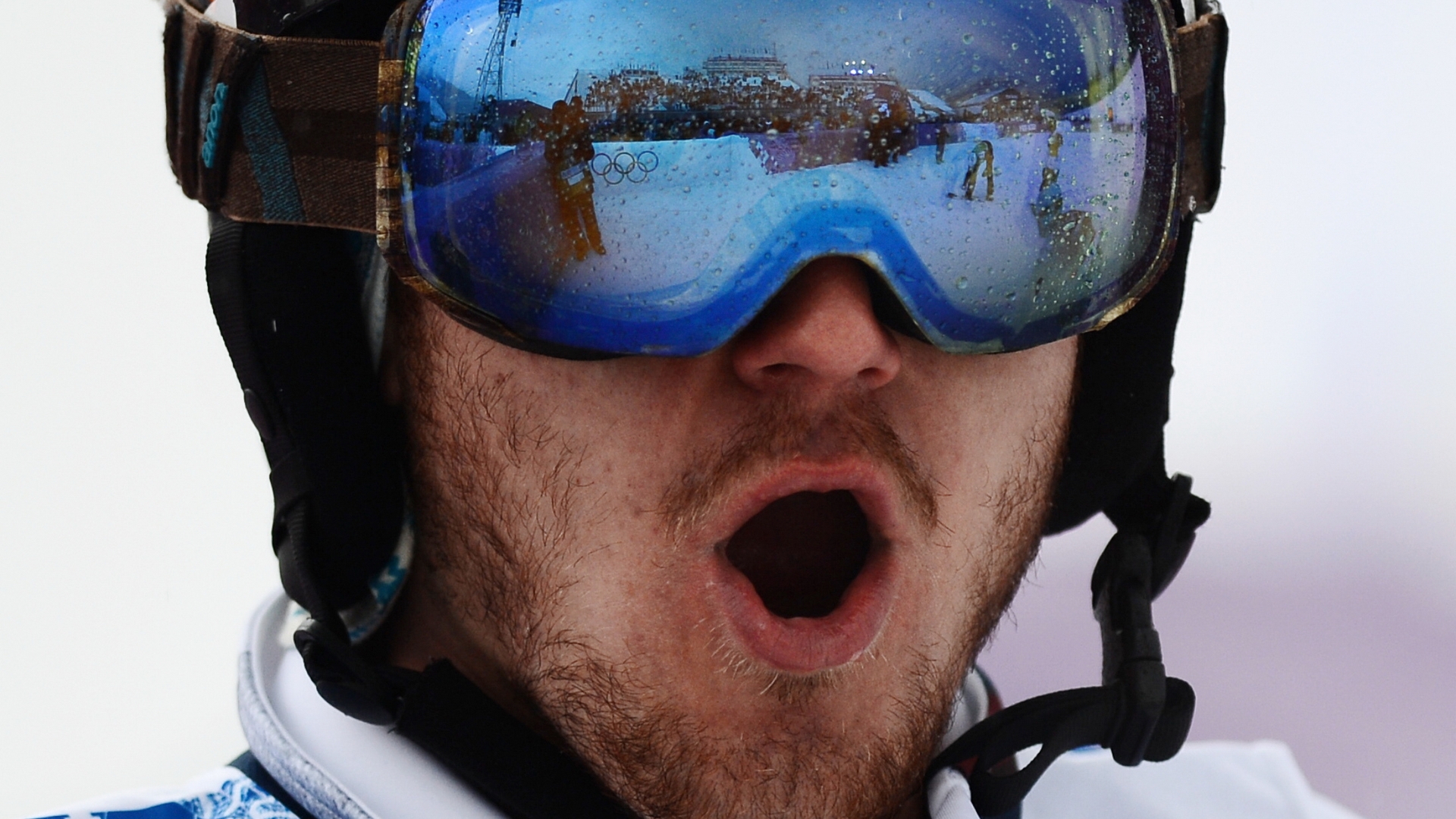 Description: A man with a snowboard helmet and goggles on making a surprised face with his mouth open and his mouth wide open.