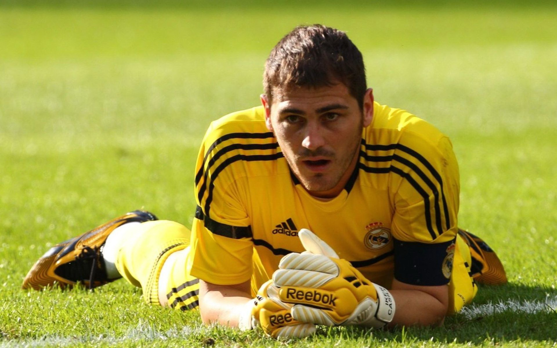 Description: A soccer player laying on the ground with his glove on his chest and looking at the camera with a surprised look on his face.