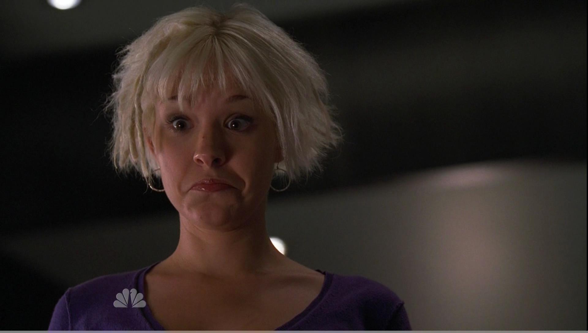 Description: A woman with a surprised look on her face in a dark room with lights on the ceiling and a light on.