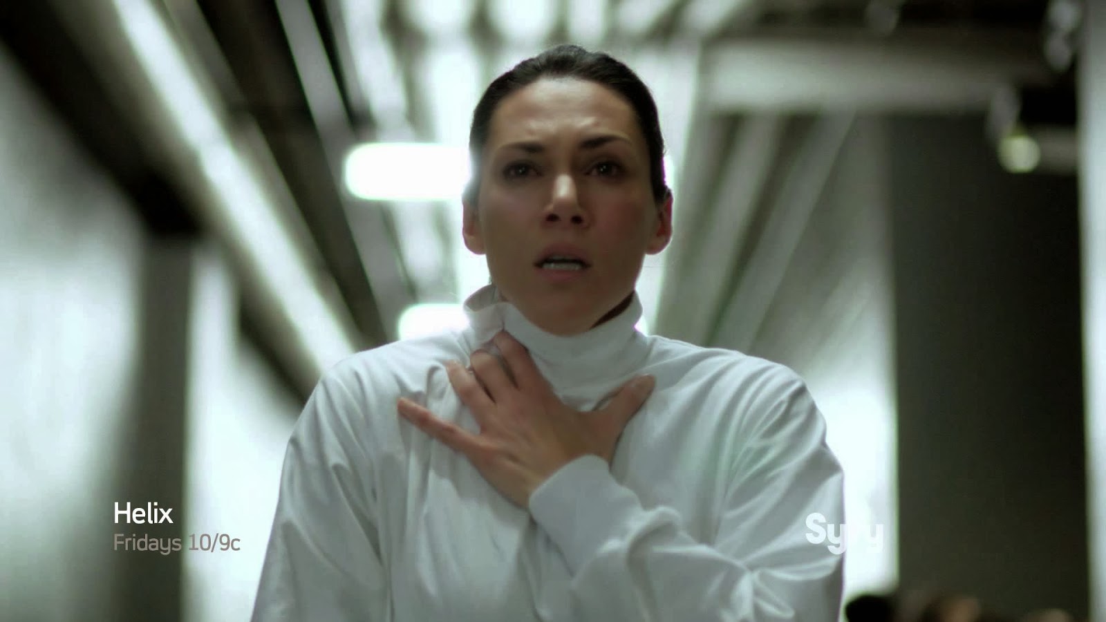 Description: A woman in a white shirt is holding her hands together to her chest and looking at the camera with a surprised look on her face.