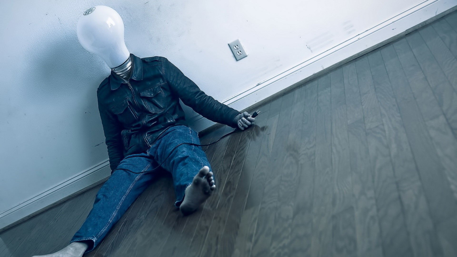 Description: A person laying on the floor with a lamp on their head and a light bulb on their head.
