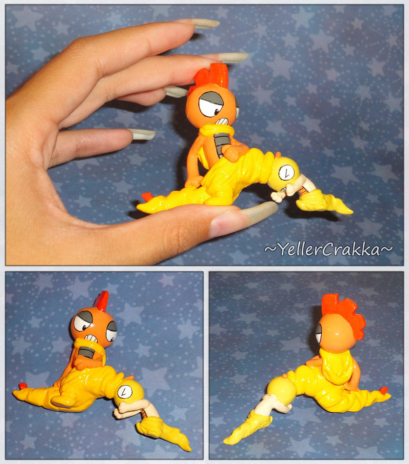 Description: A person holding a yellow toy in their hand and a picture of a person with a red hair and a yellow figure.