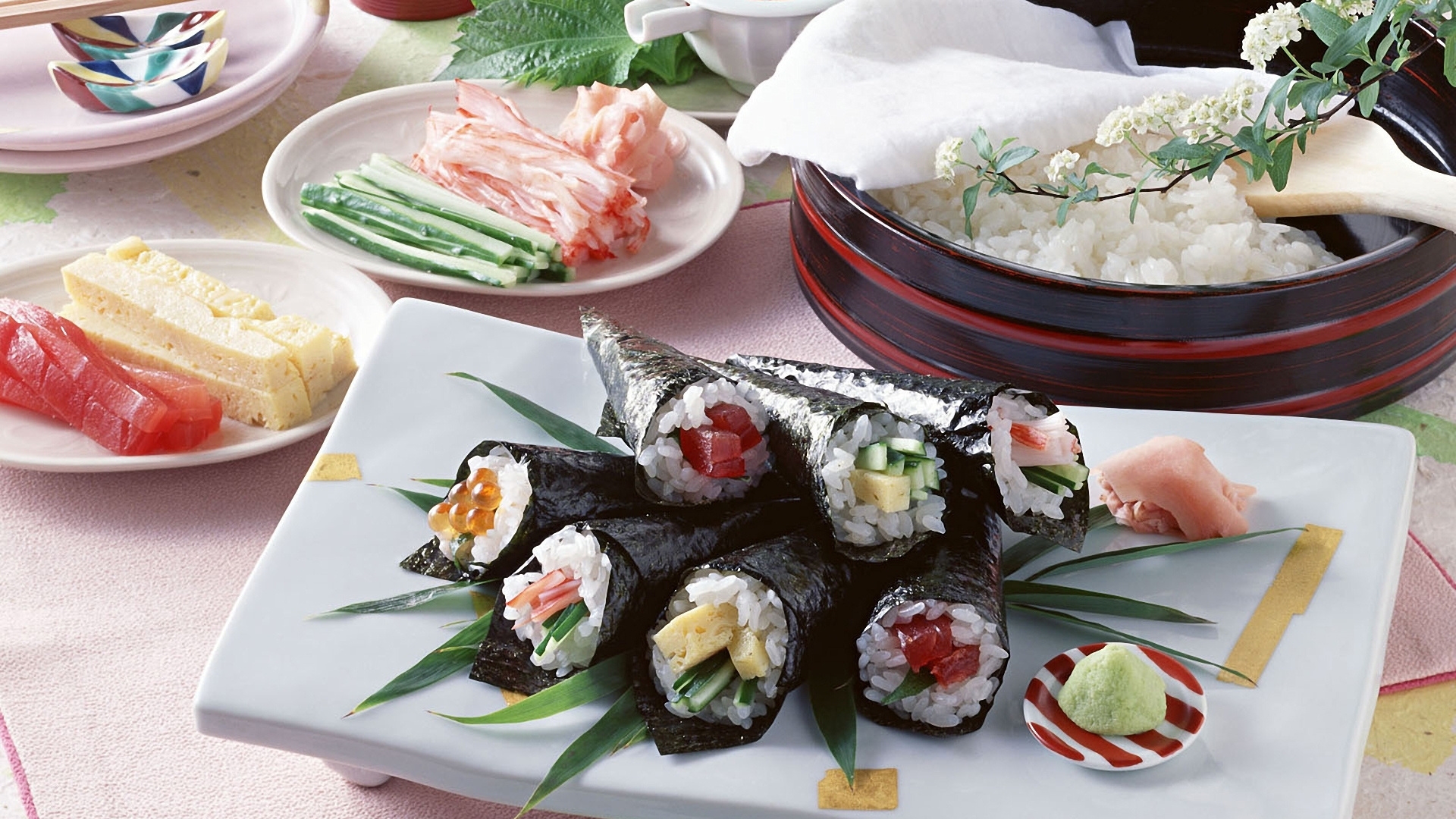 Description: A plate of sushi and other food on a table with a bowl of rice and a bowl of vegetables.
