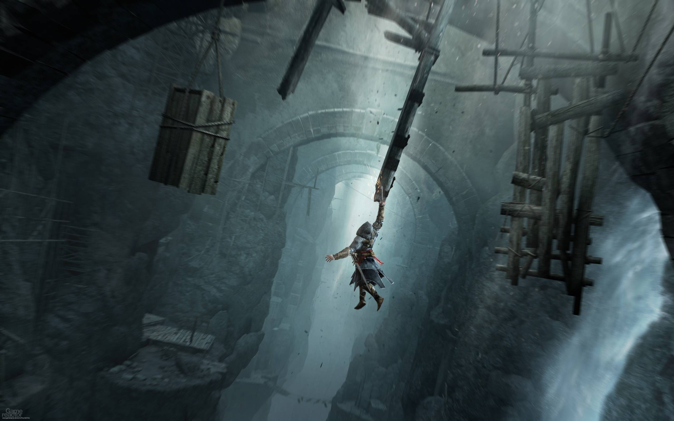 Description: A person is suspended from a rope in a tunnel in a game of thrones and ruins.