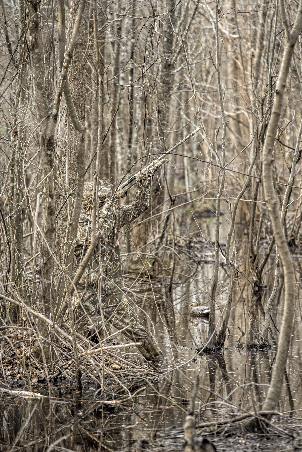 Description: A swampy area with a small creek in the middle of it and trees in the background with no leaves.
