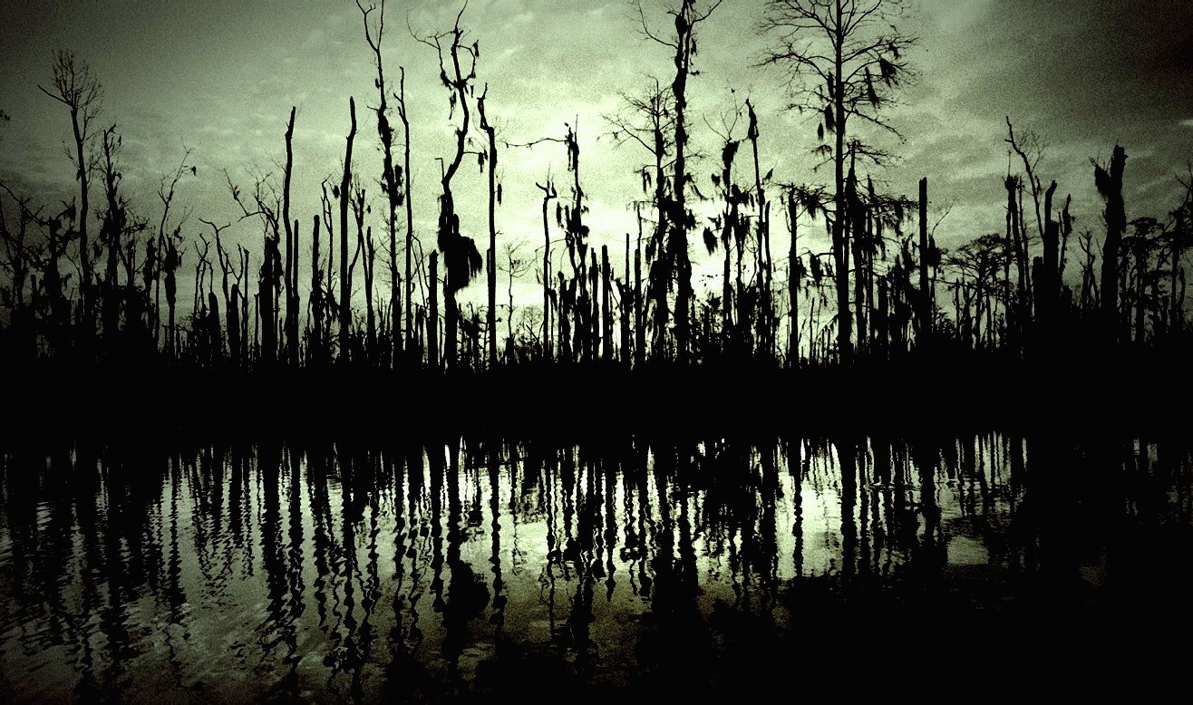 Description: A swampy area with trees and water at sunset or dawn with a bird in the distance and a dark sky.