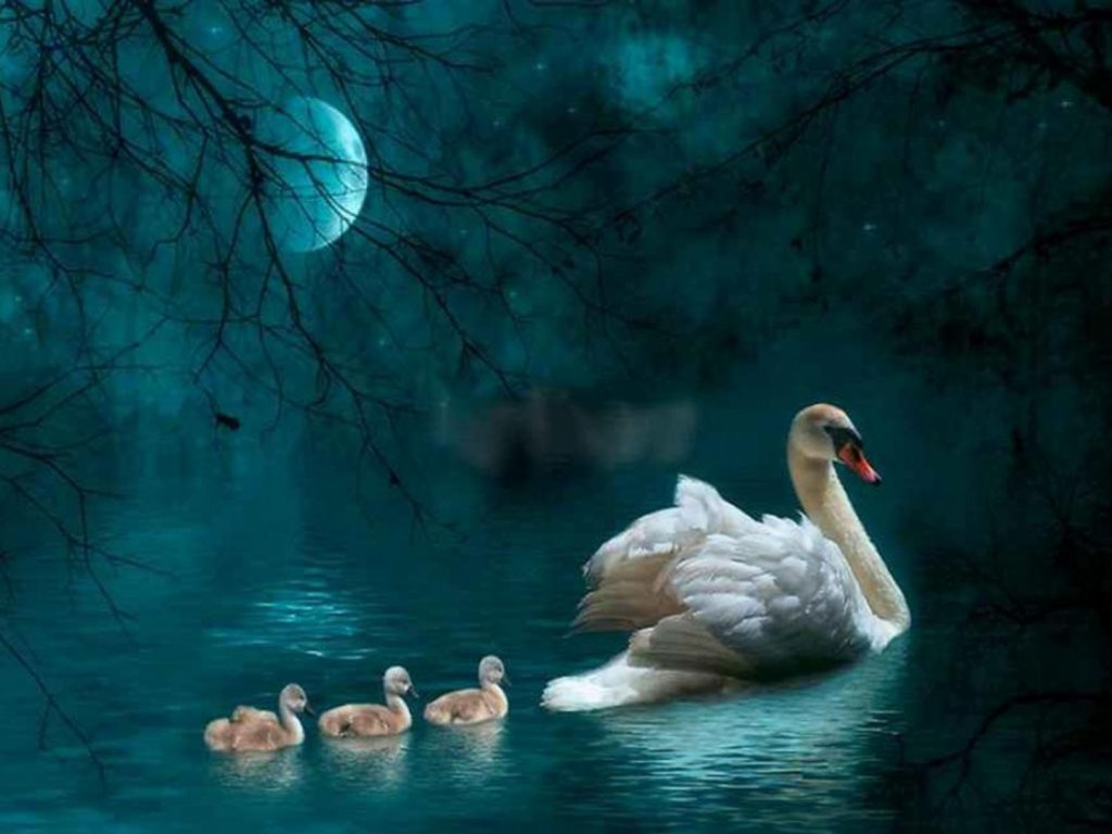 Description: A swan with her babies swimming in the water at night with a full moon in the background and a tree branch in the foreground.