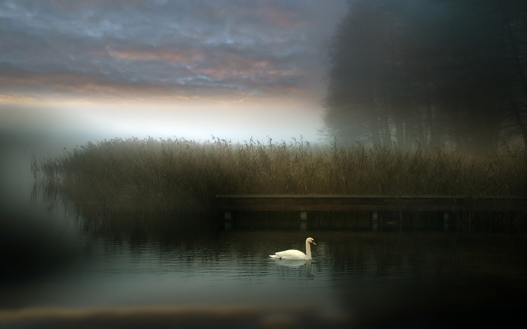 Description: A swan swimming in a lake with tall grass in the background and a bench in the foreground with a dark sky.