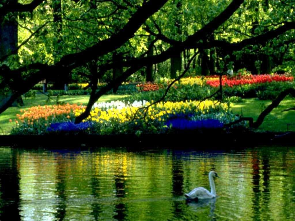 Description: A swan swimming in a pond surrounded by flowers and trees in a park setting with a bench and trees.