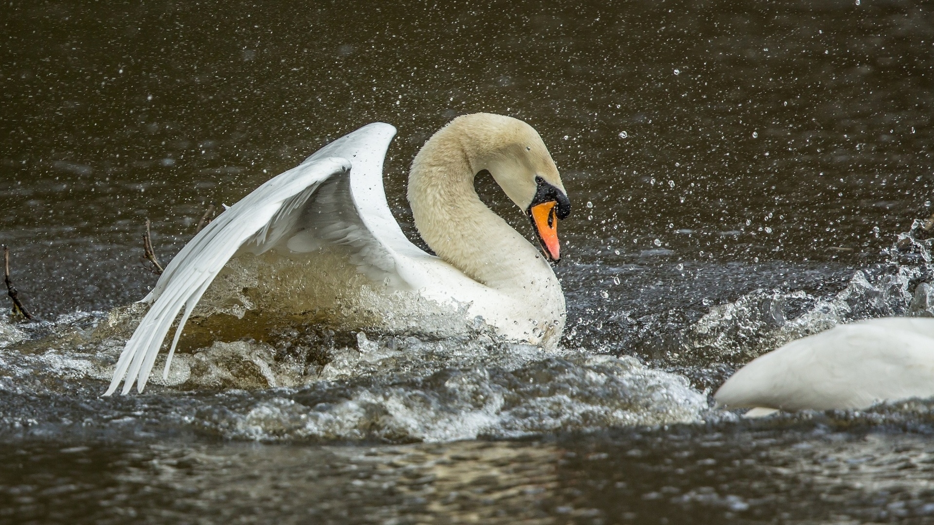 Description: A swan is swimming in the water with its wings spread out and it is about to take off from the water.