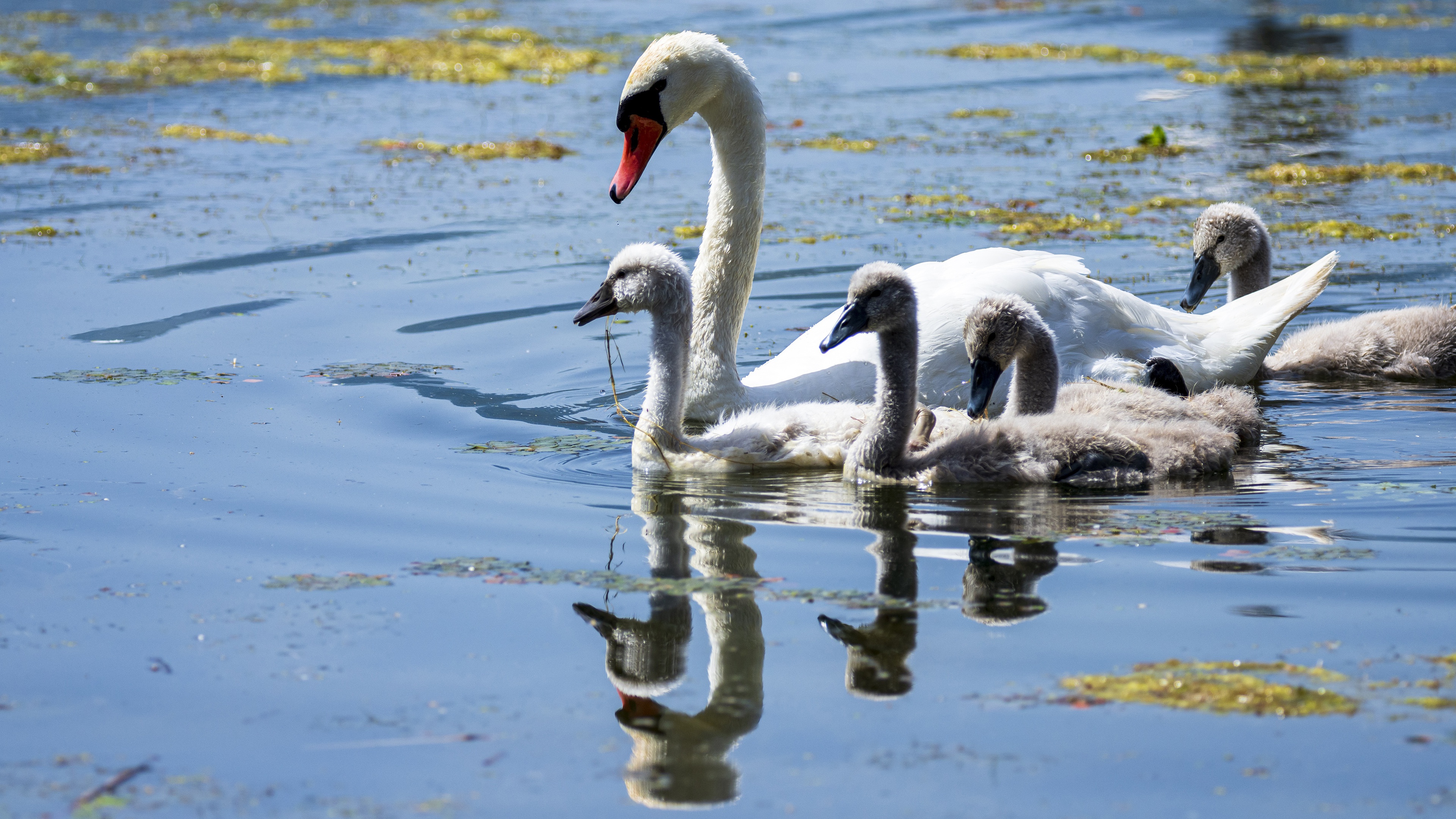 Description: A group of swans swimming in a lake together with their babies in the water and looking for food to eat.