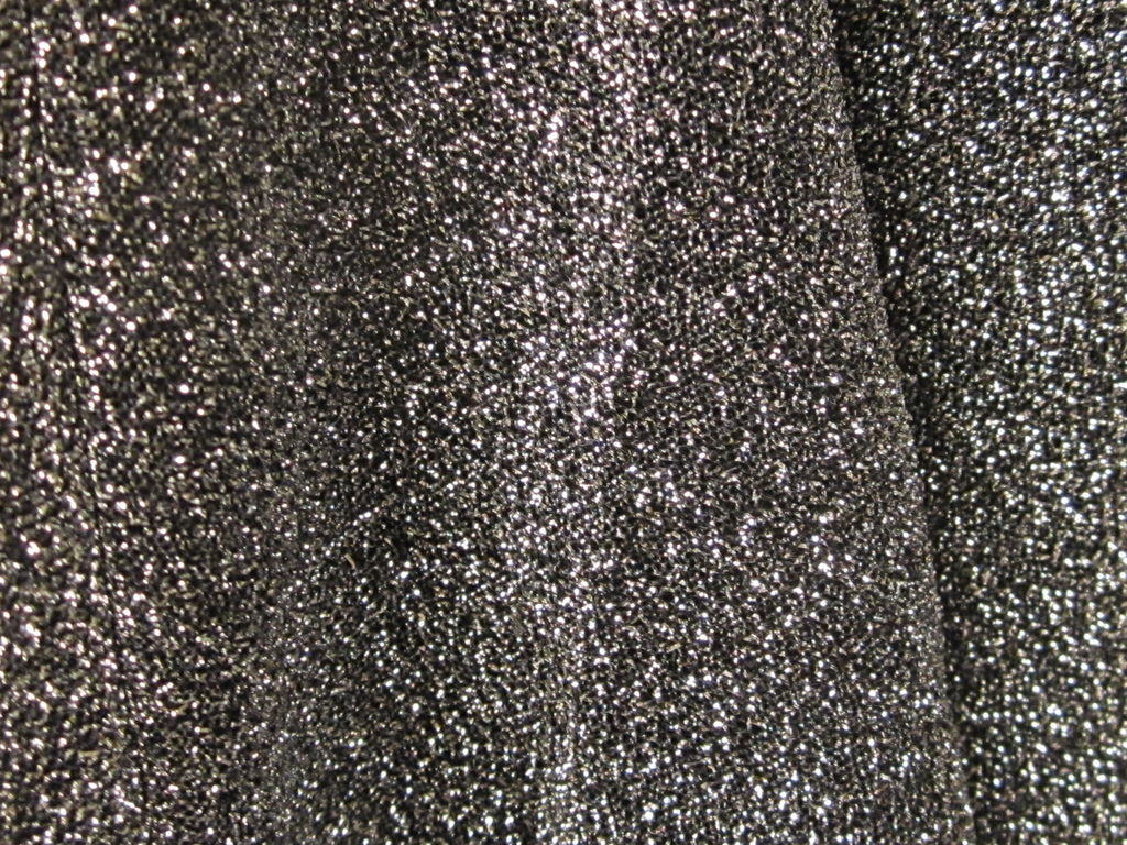 Description: A close up of a black and white photo of a sweater with silver speckles on it and a black and white background.
