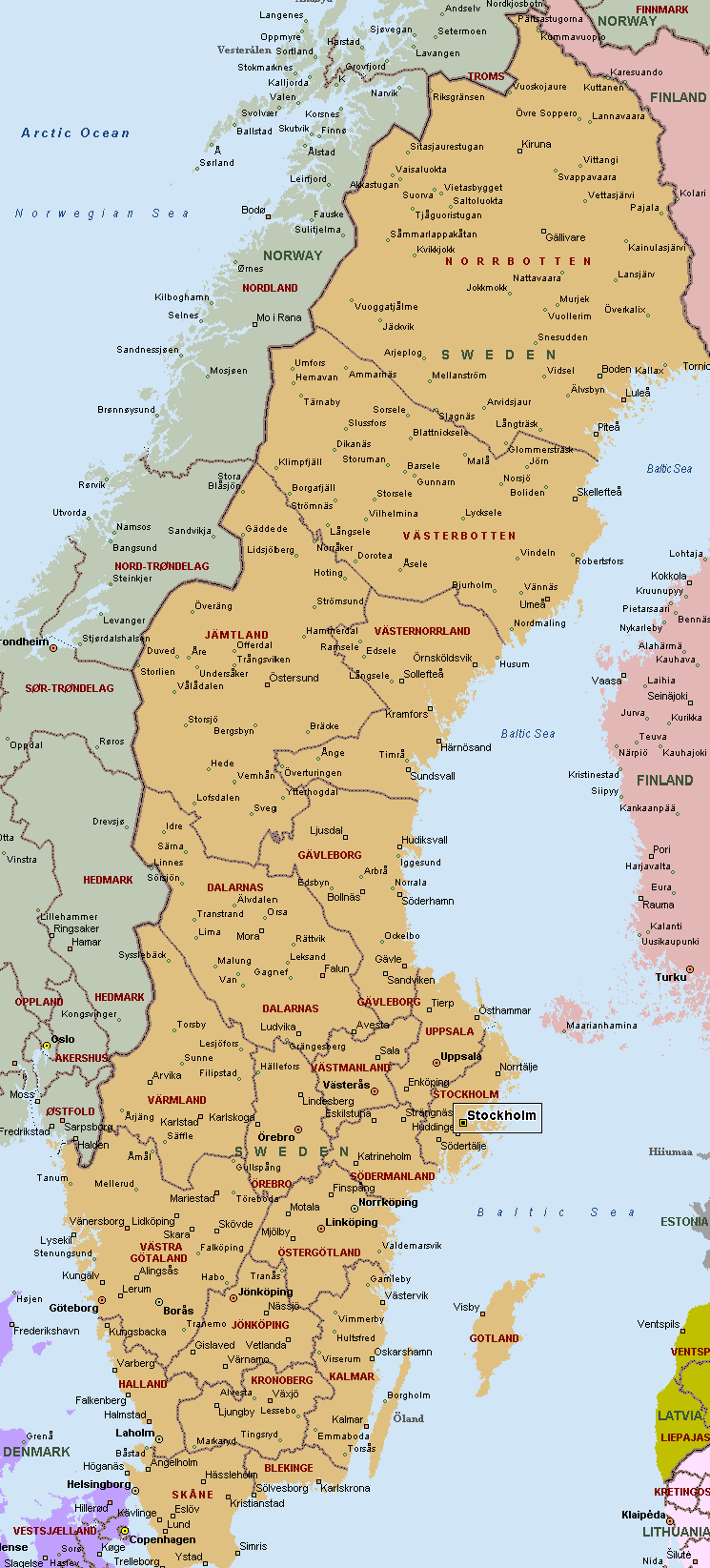 Description: A map of the country of sweden with all the major cities and major roads in red and yellow.