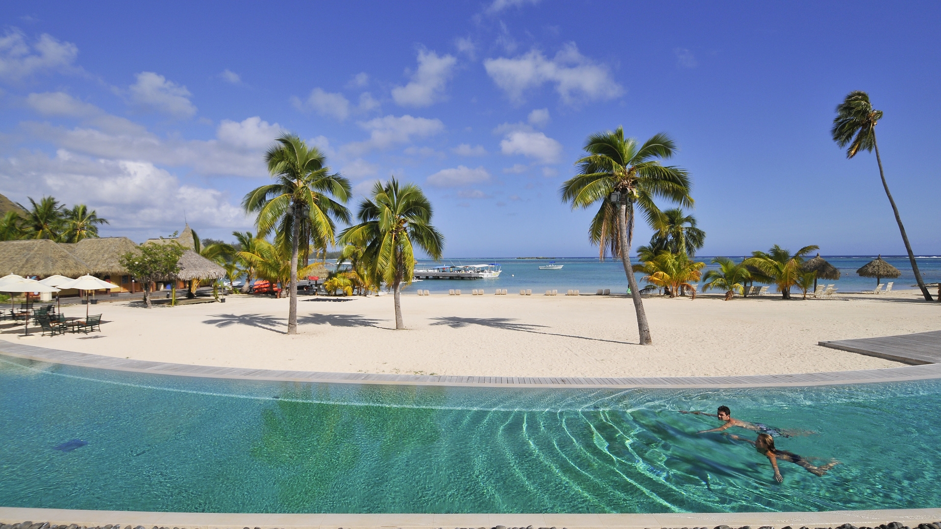 Description: A man swimming in a pool surrounded by palm trees and a beach with a boat in the background and a boat in the water.