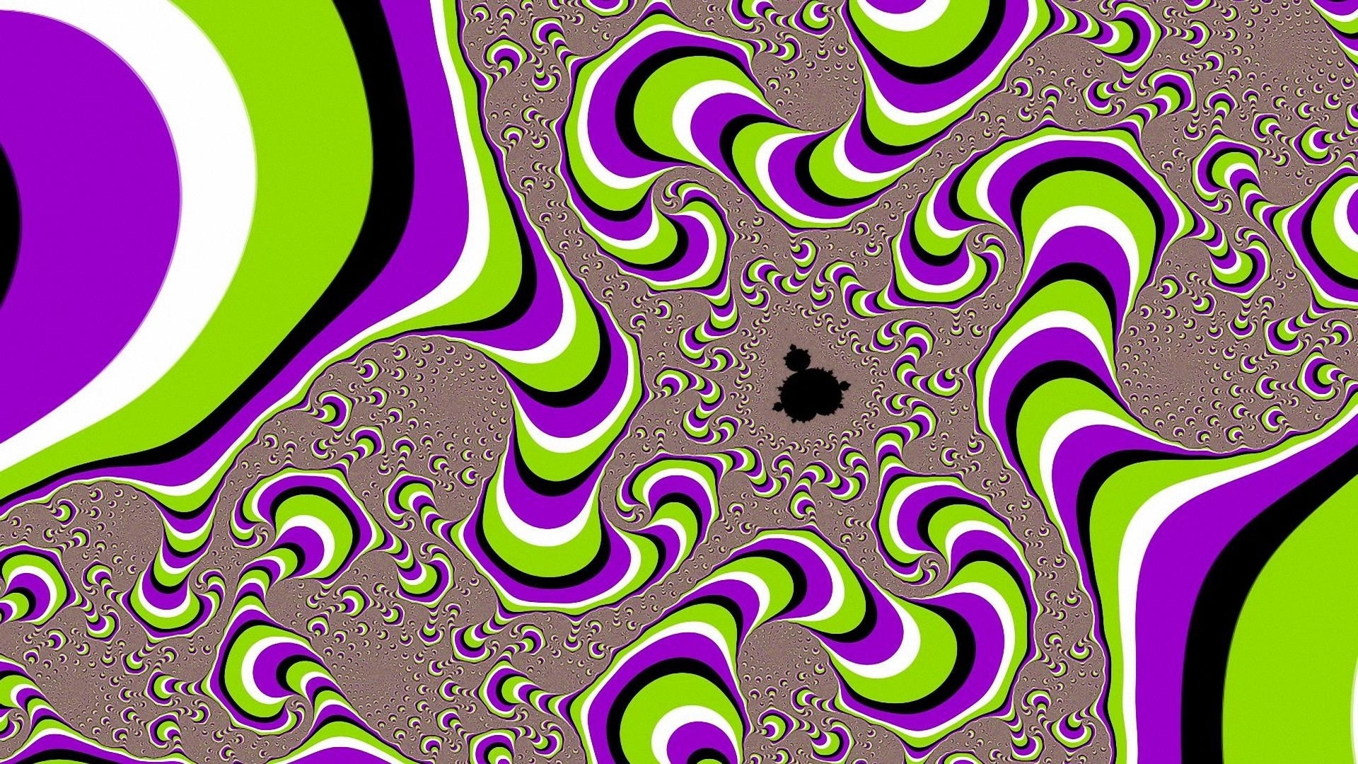 Description: A computer generated image of a swirly background with a black apple in the center of the image and a green and purple swirl.