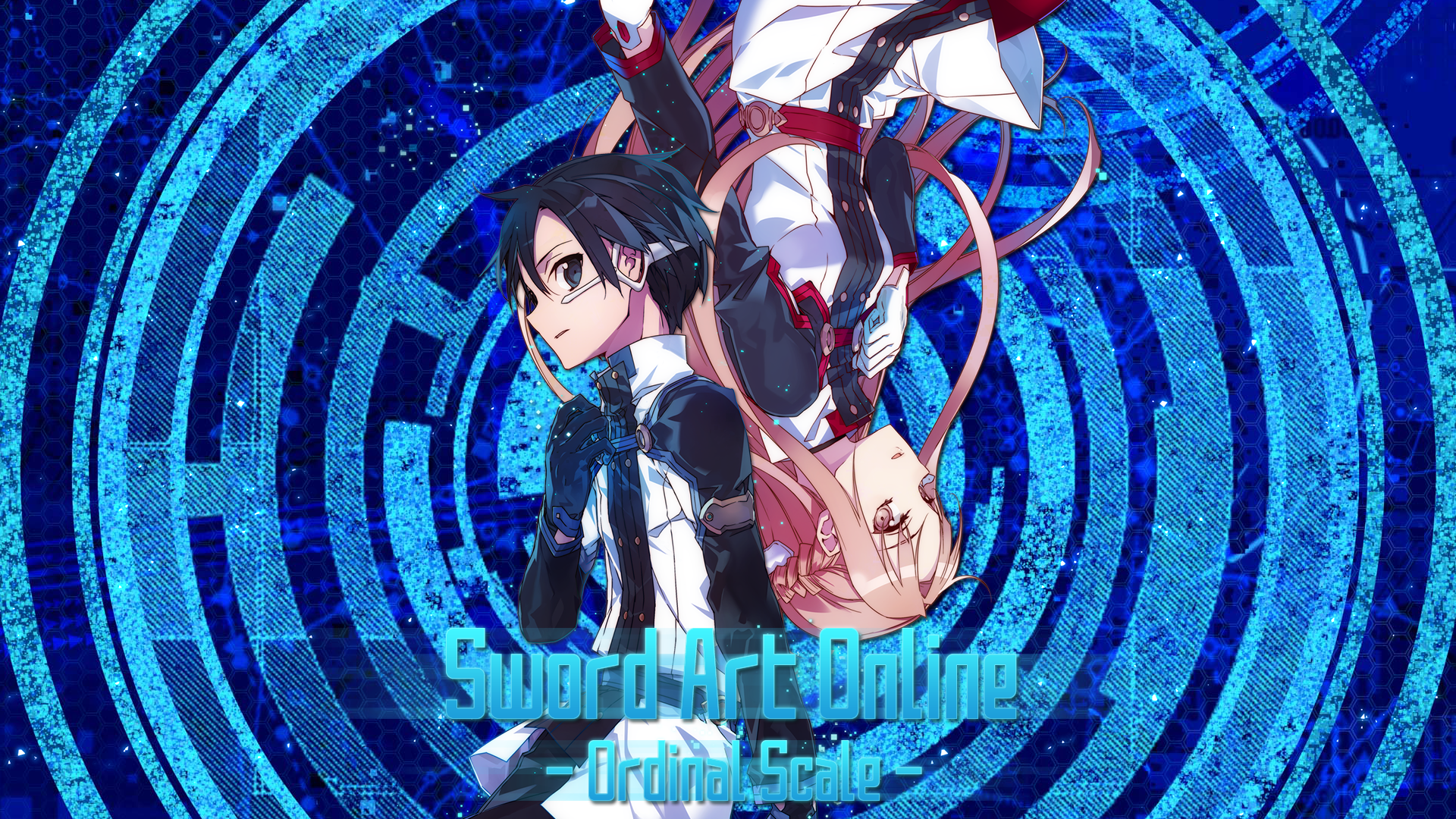 Description: A anime character with a sword in front of a blue background with a circular design and a caption that reads sword art anime.