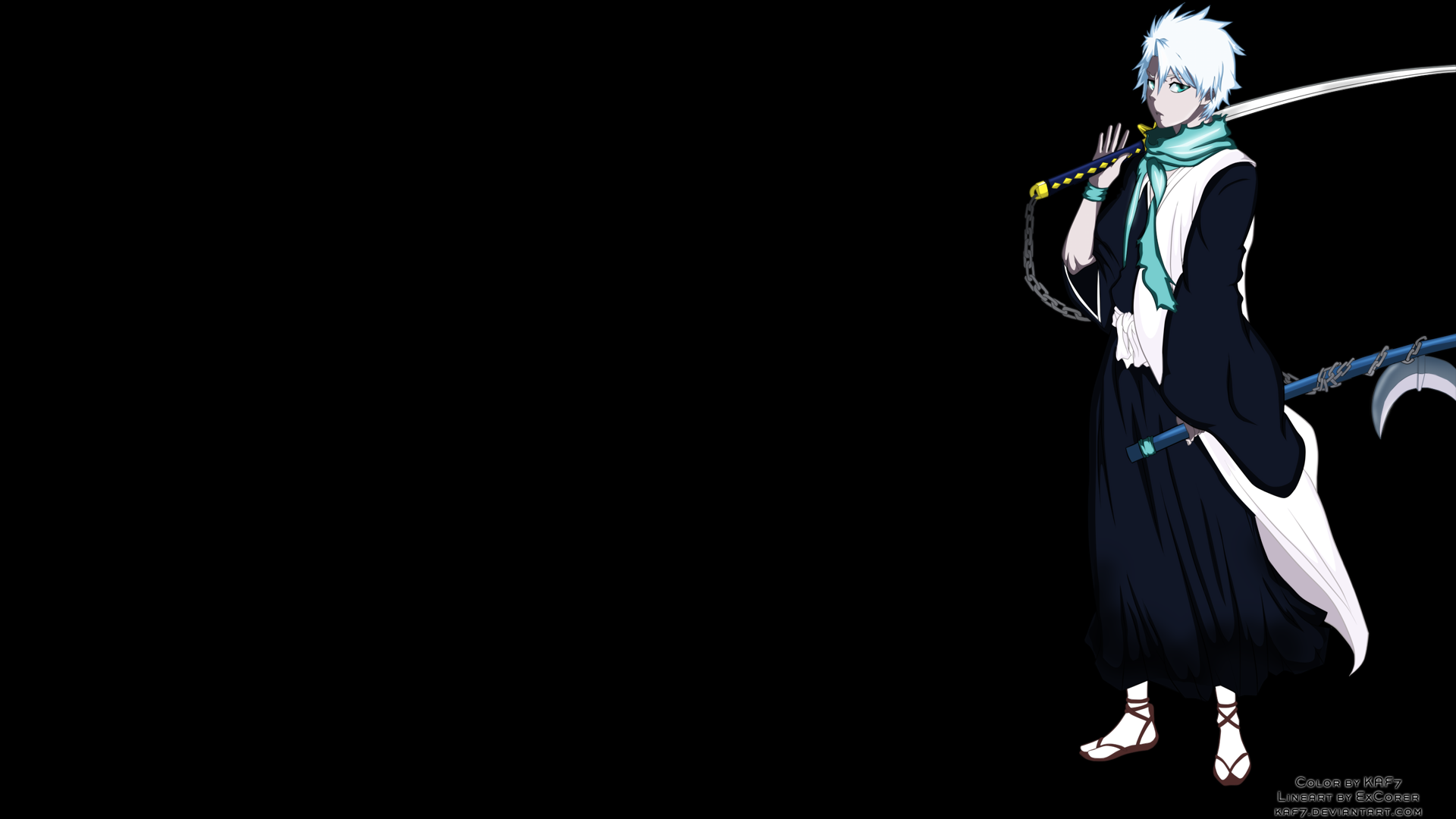 Description: A person with a sword in their hand and a black background with a black background and a white haired woman with a black dress.