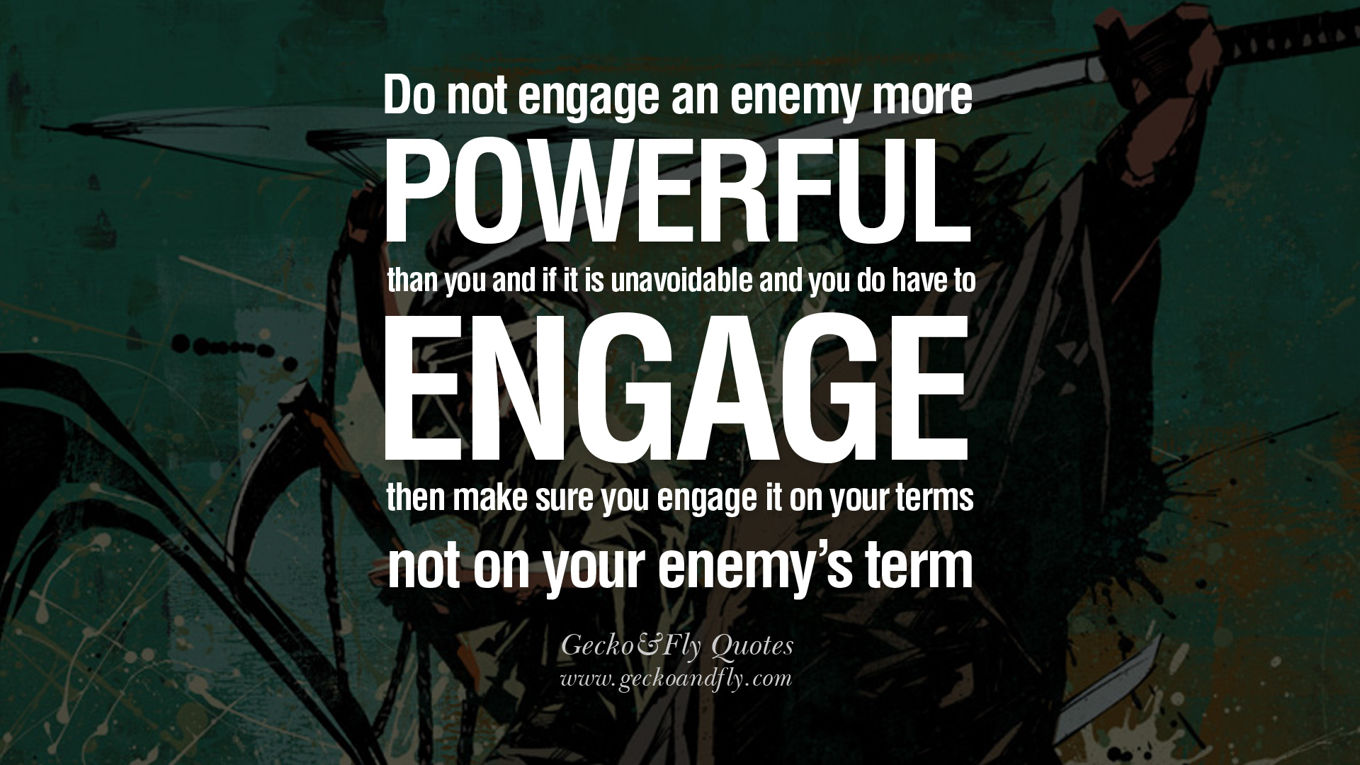Description: A quote from a man with a sword in his hand and a green background with a black and white image of a man holding a sword.