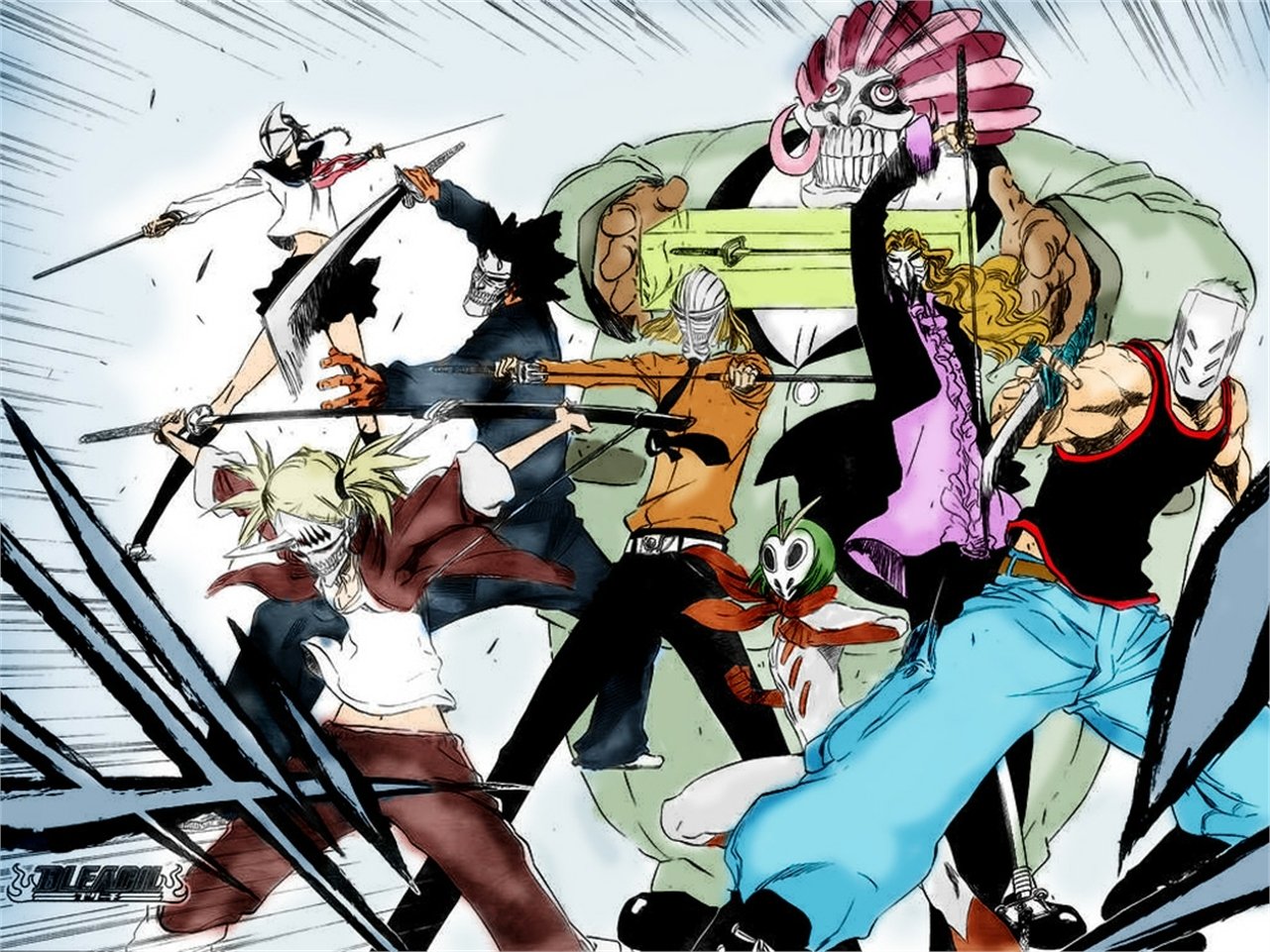 Description: A group of people with swords and a skull on their head and arms.
