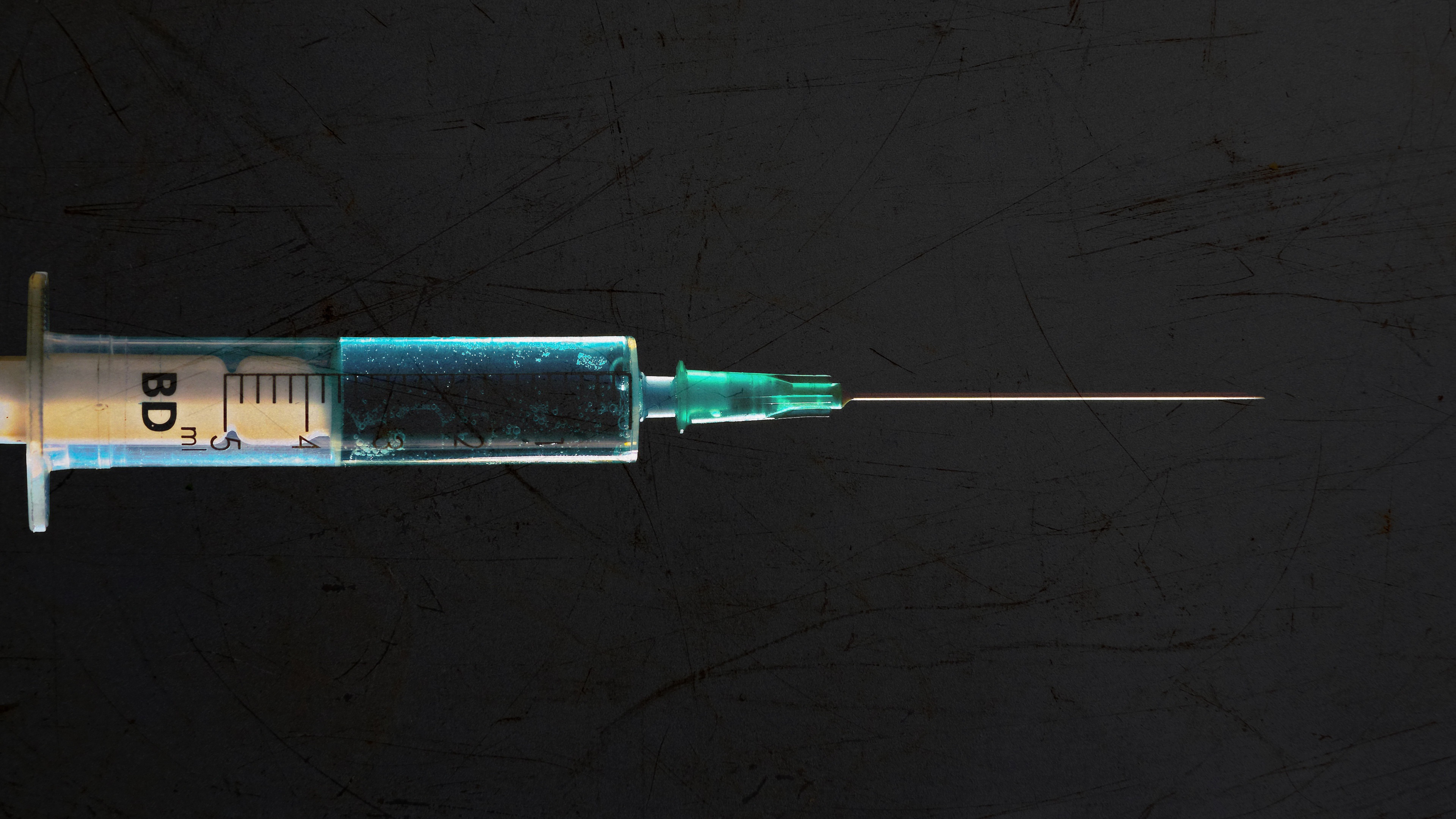 Description: A syil with a needle sticking out of it's end on a black surface with a black background.