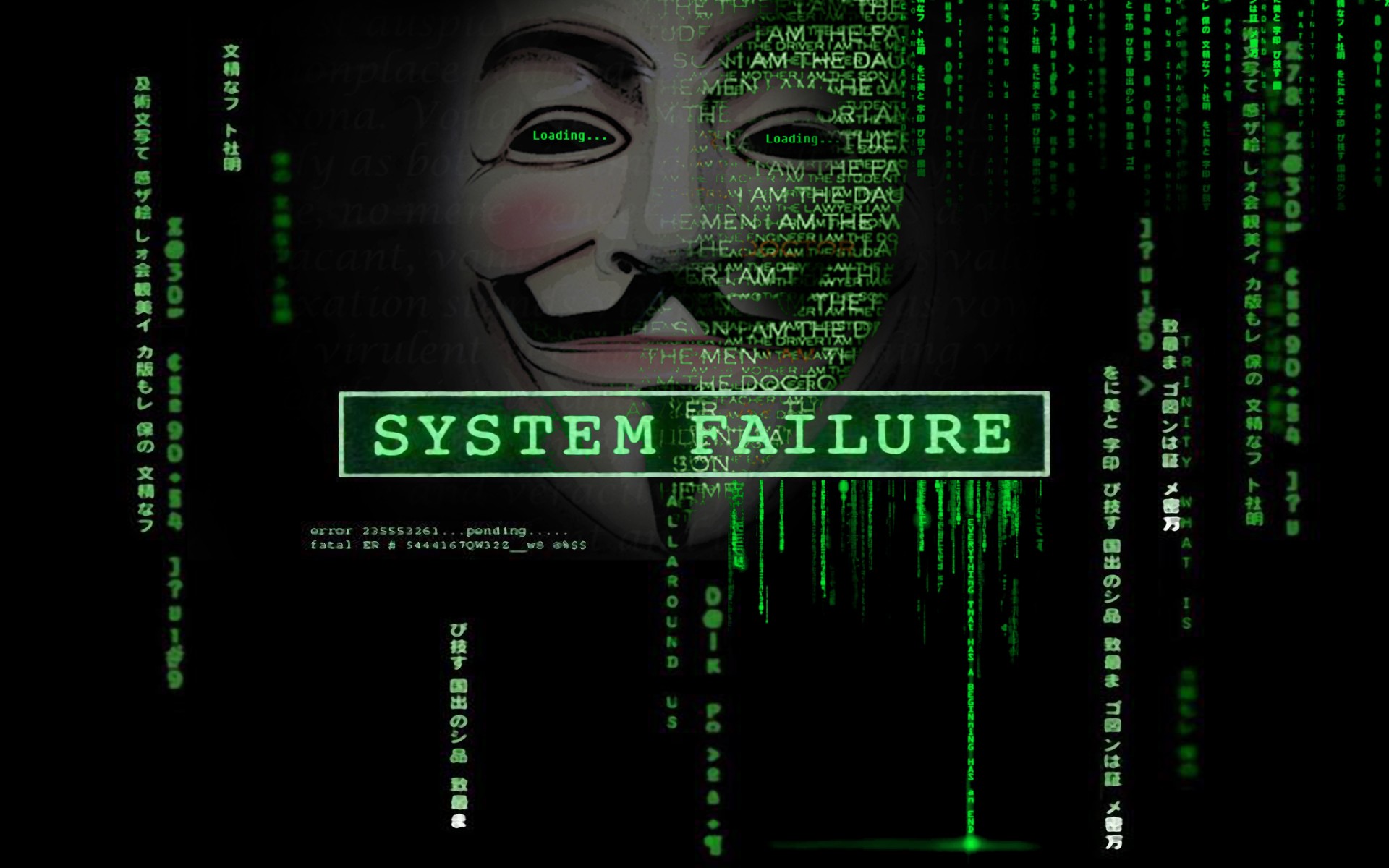 Description: A mask with the words system failure on it and a green background with a black background with white numbers.