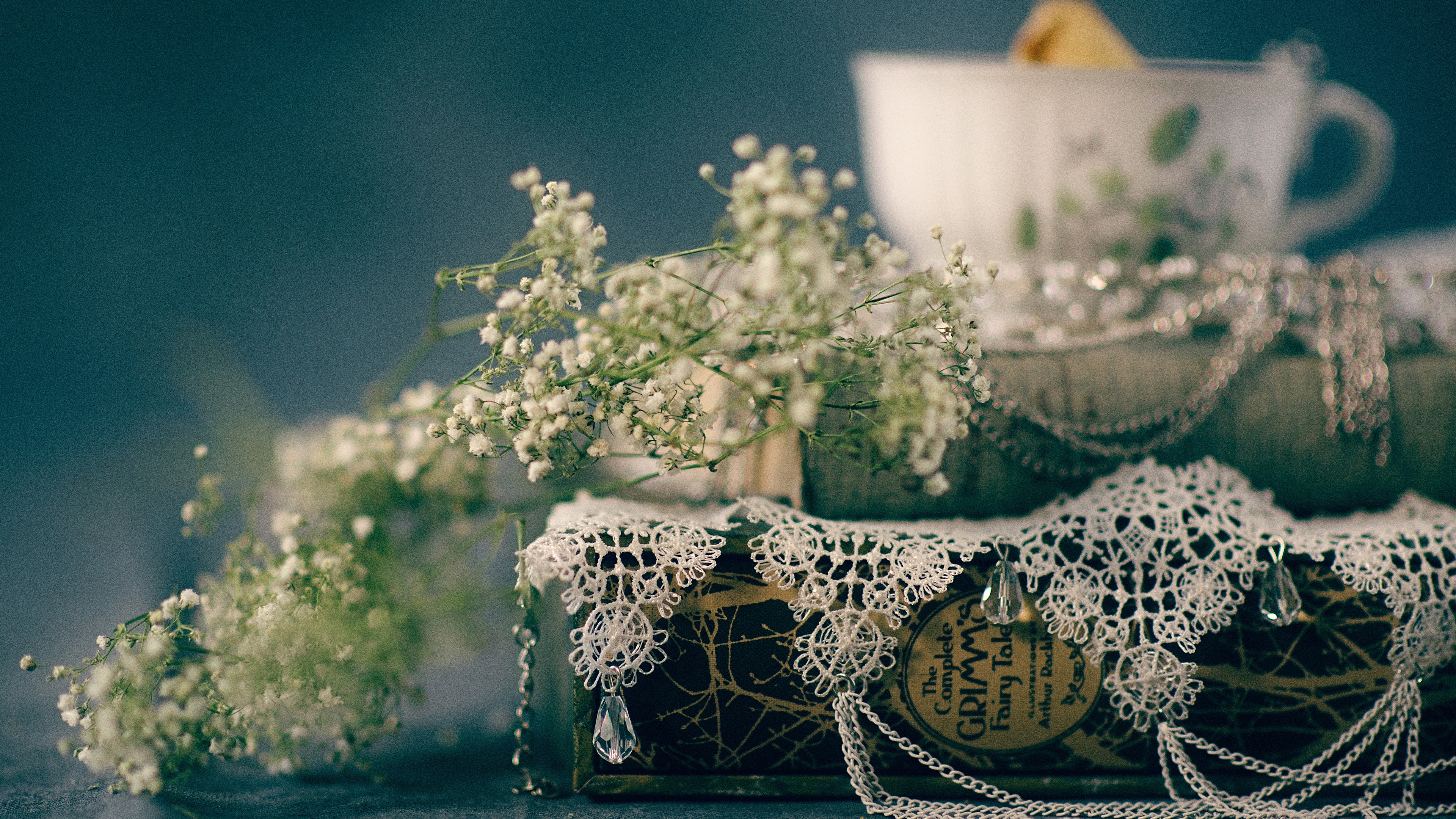 Description: A table topped with a cup and a vase filled with flowers and a lace covered box of cookies next to a teacup.