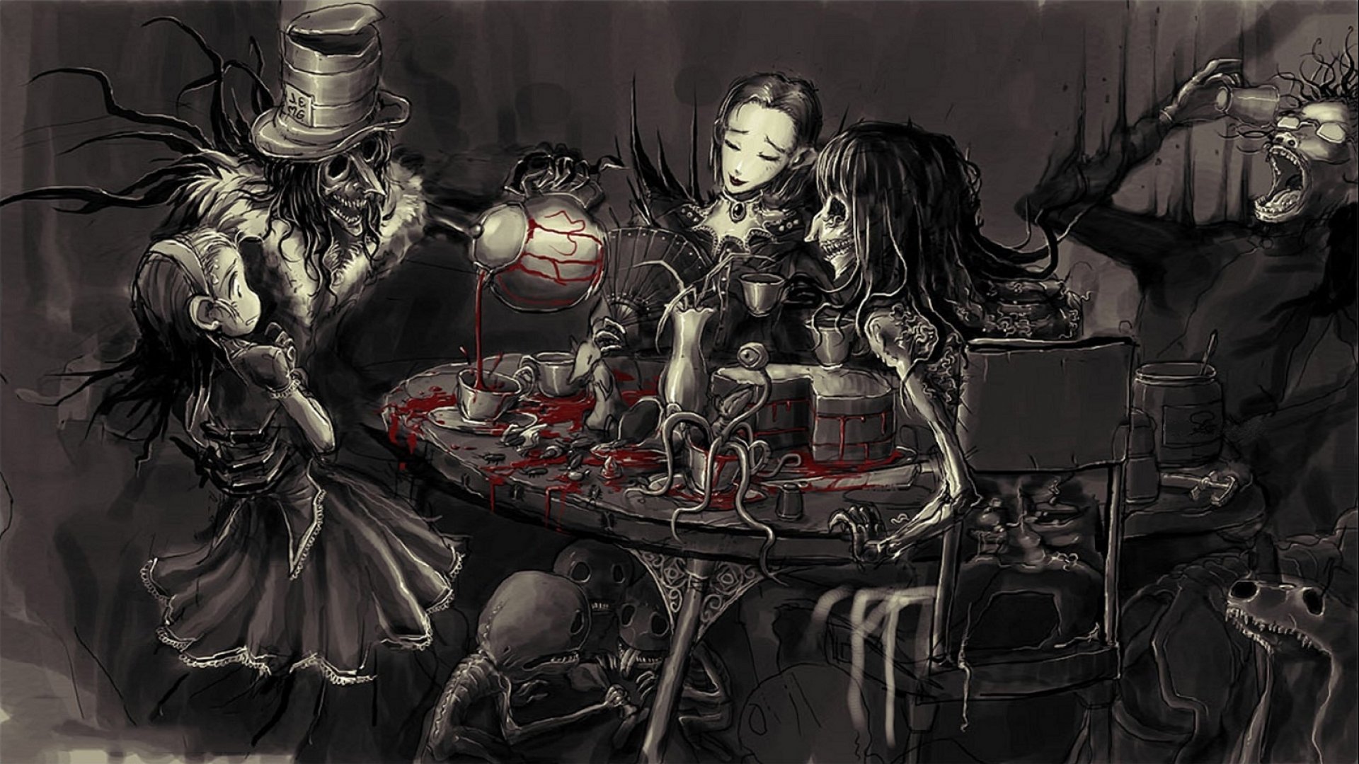 Description: A drawing of a table with a couple of dolls on it and a table with a cake on it.