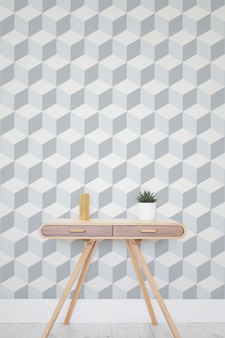 Description: A table with a plant on top of it in front of a wall with a geometric pattern on it.