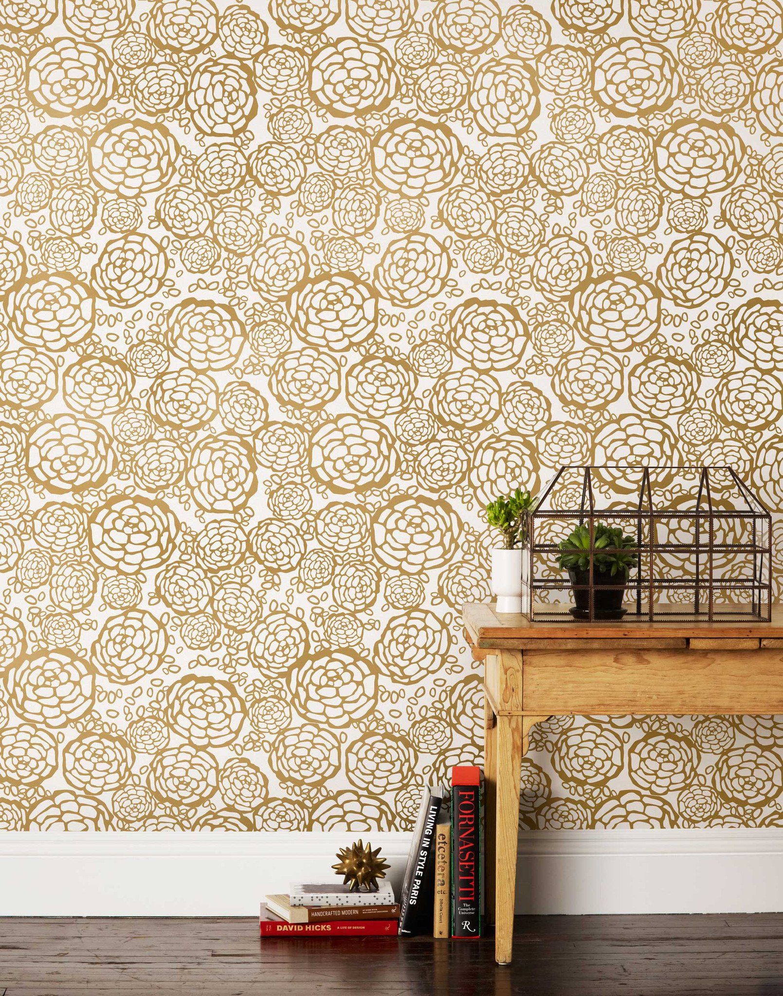 Description: A table with a plant on top of it next to a wall with a pattern on it and a basket of books.