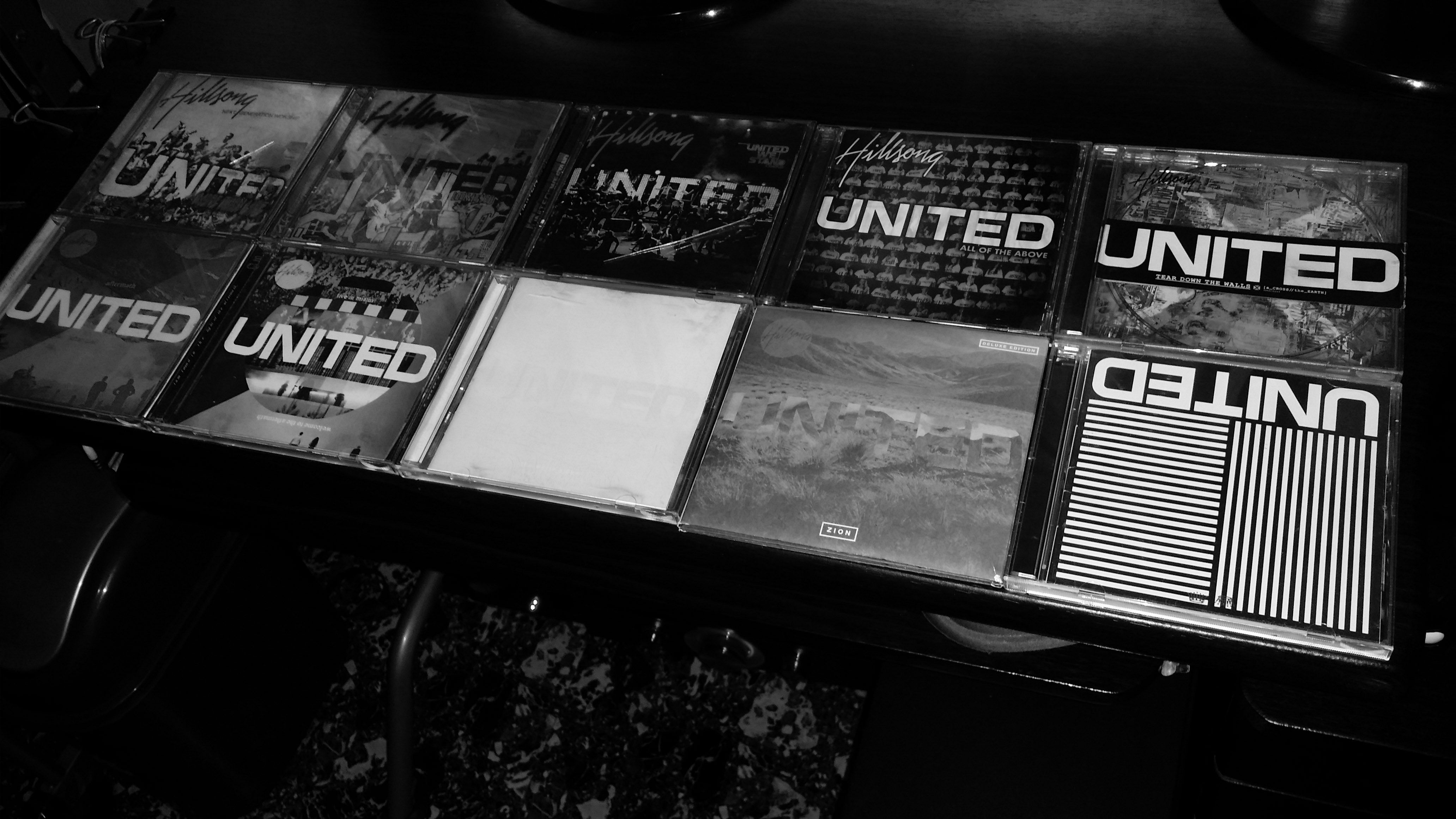 Description: A table with a bunch of records on it and a clock in the background with a wallpapered wall behind it.