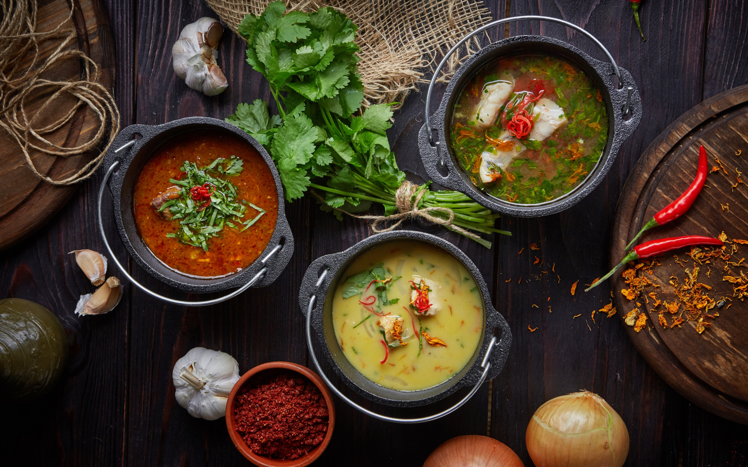 Description: A table topped with bowls of soup and vegetables next to garlic and peppers and garlic bread sticks and a wooden board.
