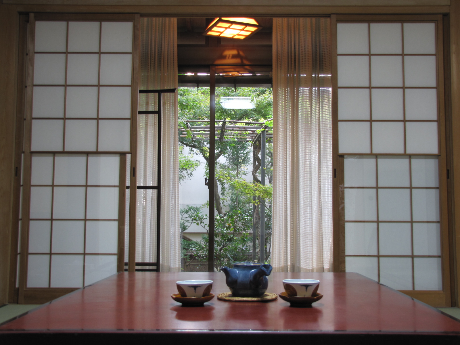 Description: A table with two cups and a vase on it in front of a window with a view of trees.