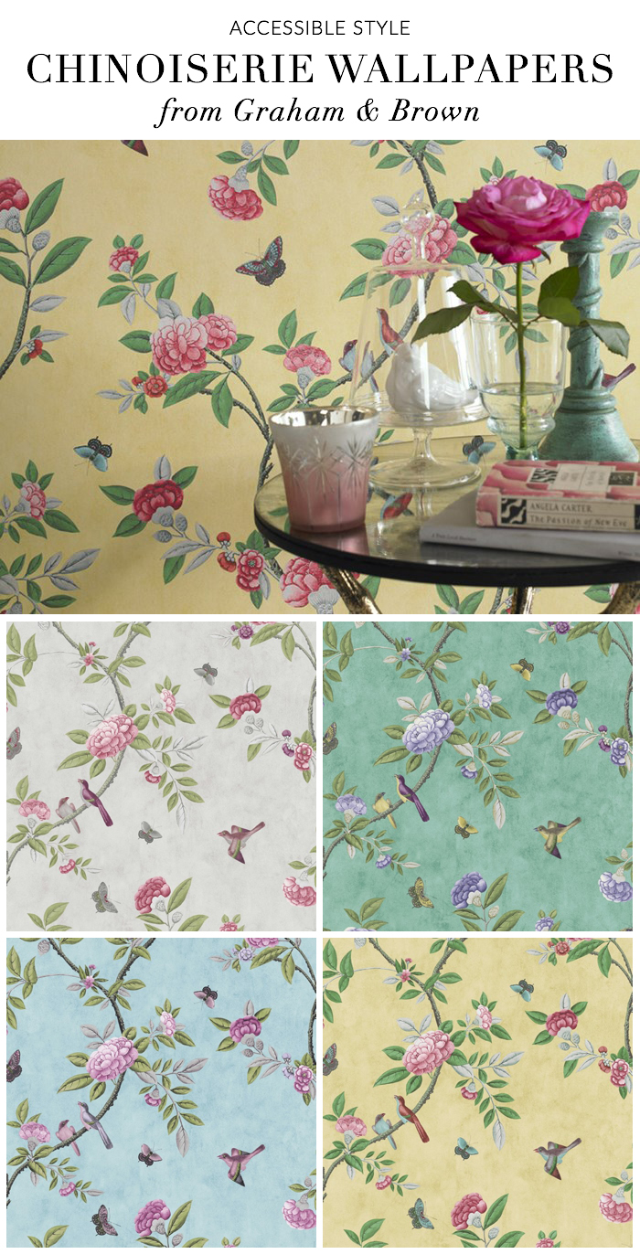 Description: A table with a vase of flowers on it and a wall paper with birds and flowers on it and a vase with flowers on it.