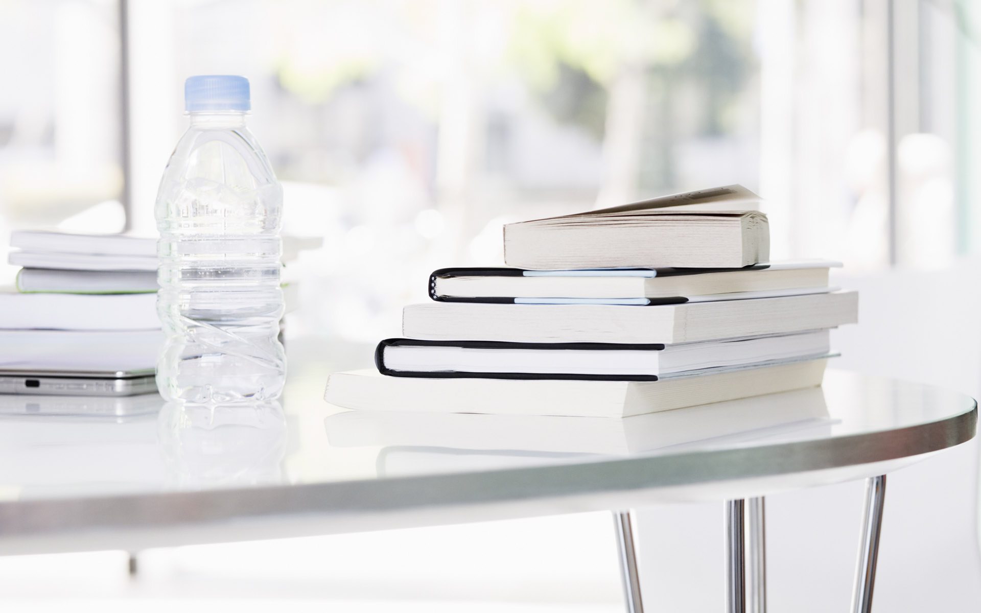 Description: A table with a bottle of water and a stack of books on it with a stack of books on top of it.