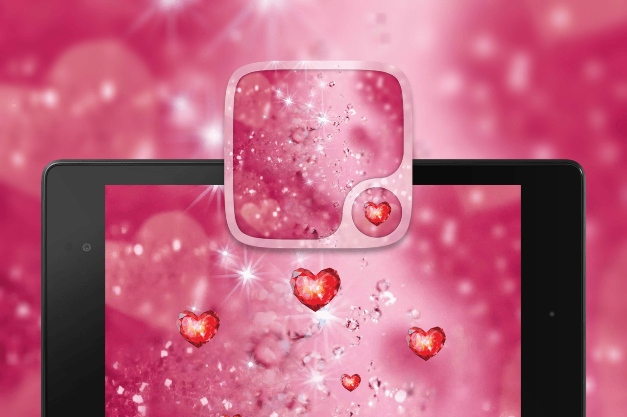 Description: A tablet with hearts floating out of it and a pink background with stars and bubbles in the background and a pink background with hearts.