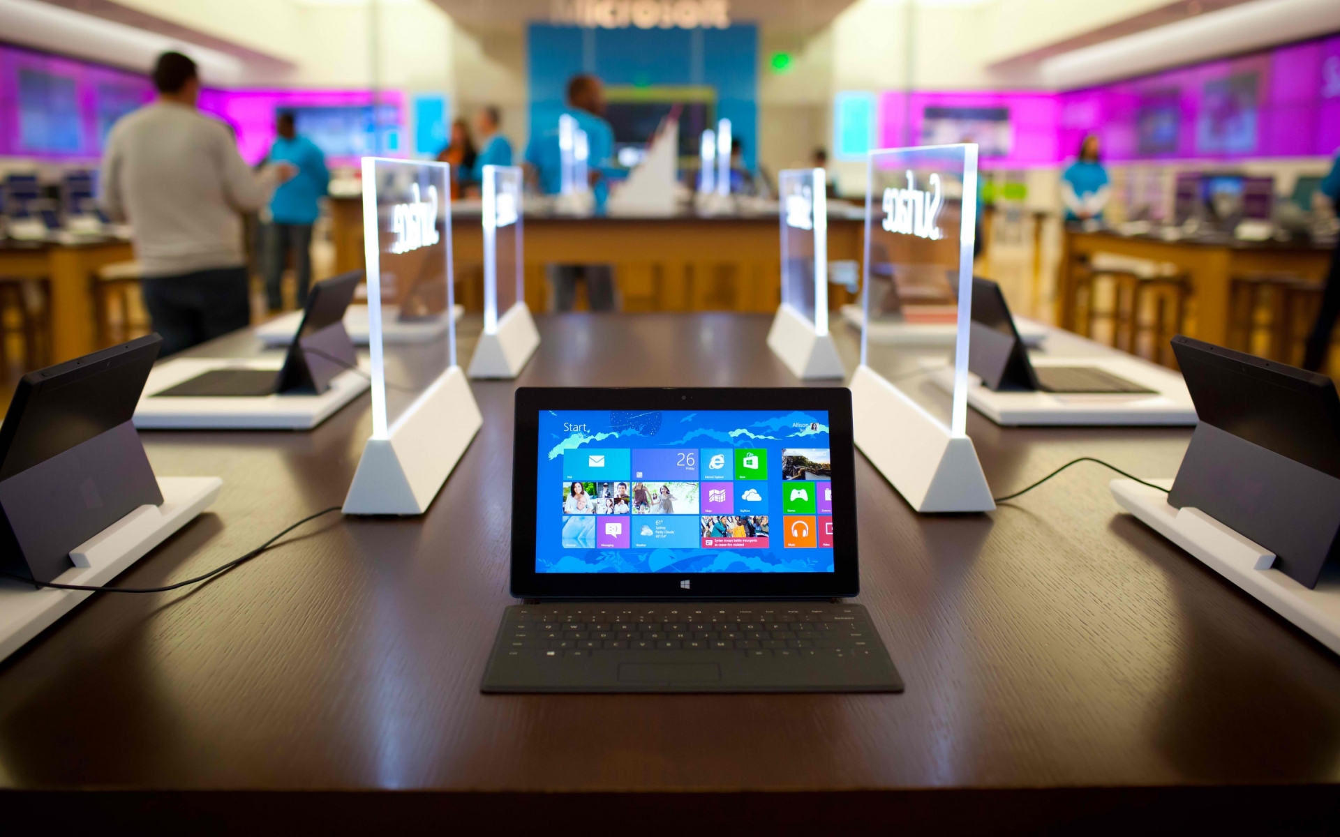 Description: A tablet computer sitting on top of a wooden table in a room with people in the background and a display of windows.