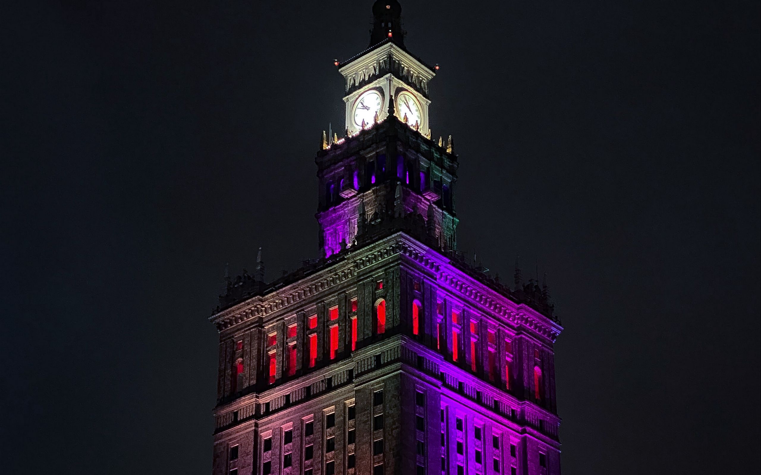 Description: A tall building with a clock on the top of it at night time with a sky background and a purple light.