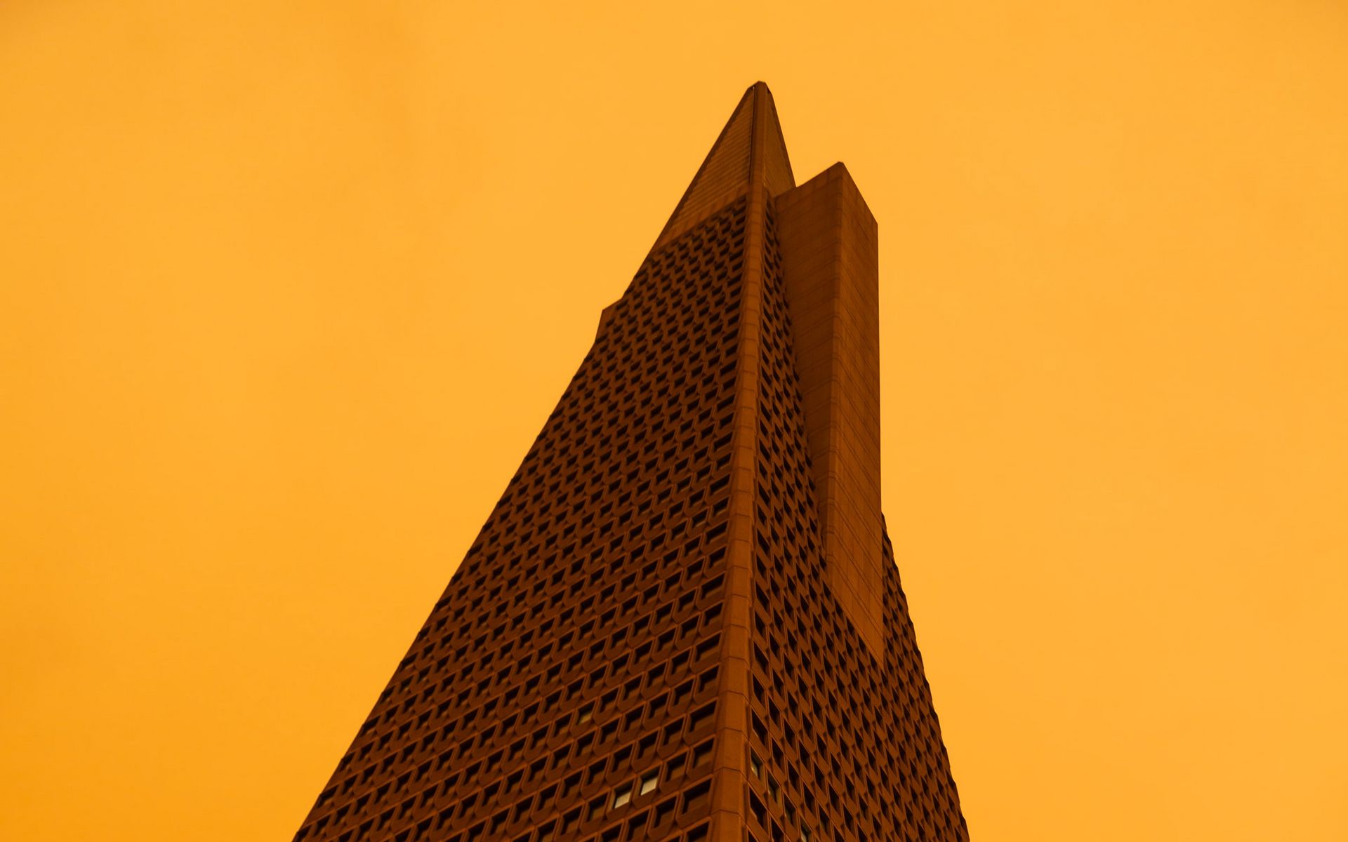 Description: A tall building with a clock on the top of it's face and a yellow sky behind it.