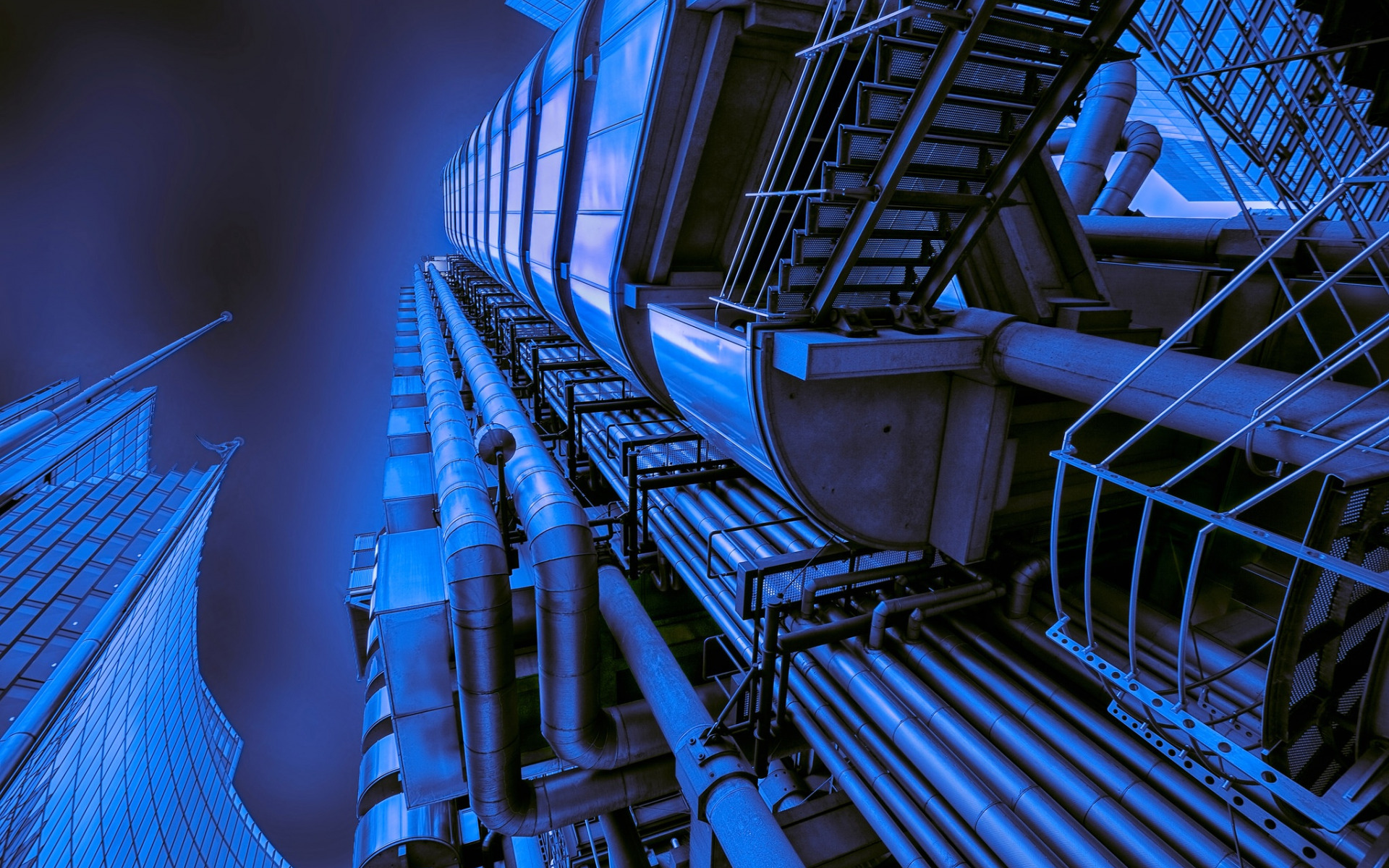Description: A very tall building with a very long metal pipe next to it's side and a sky scraper in the background.