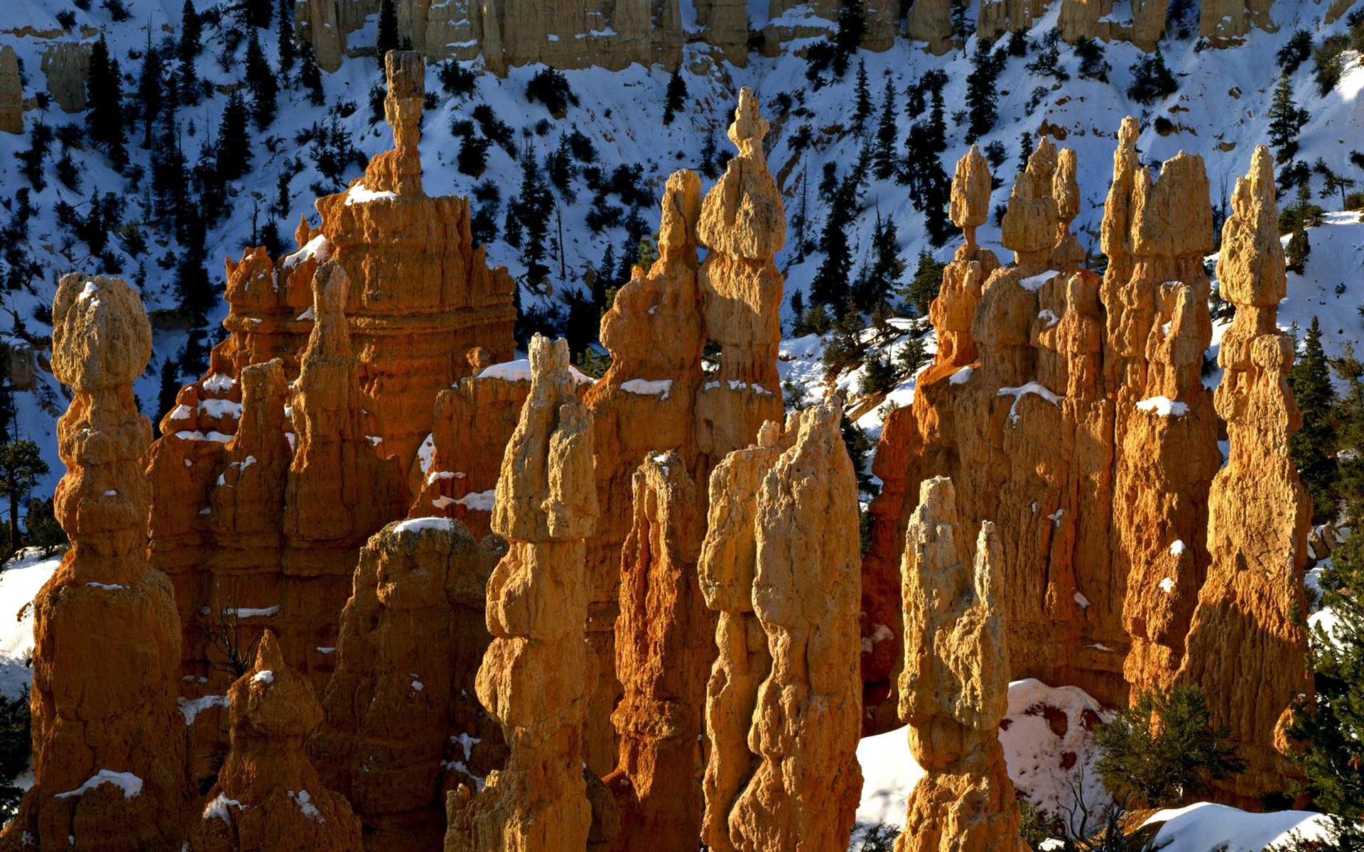 Description: A group of tall rocks in the snow near a mountain range with trees and snow on the ground and a sky background.