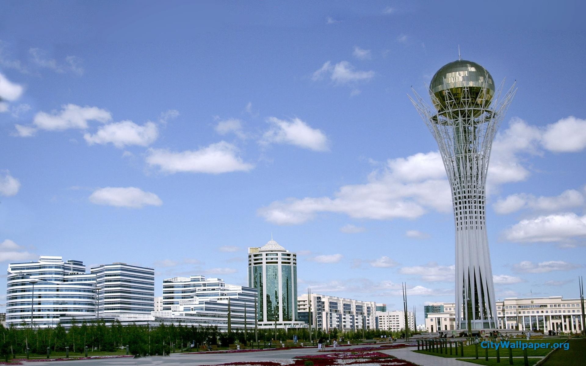 Description: A tall tower with a clock on top of it's side in a city park with a lot of buildings.