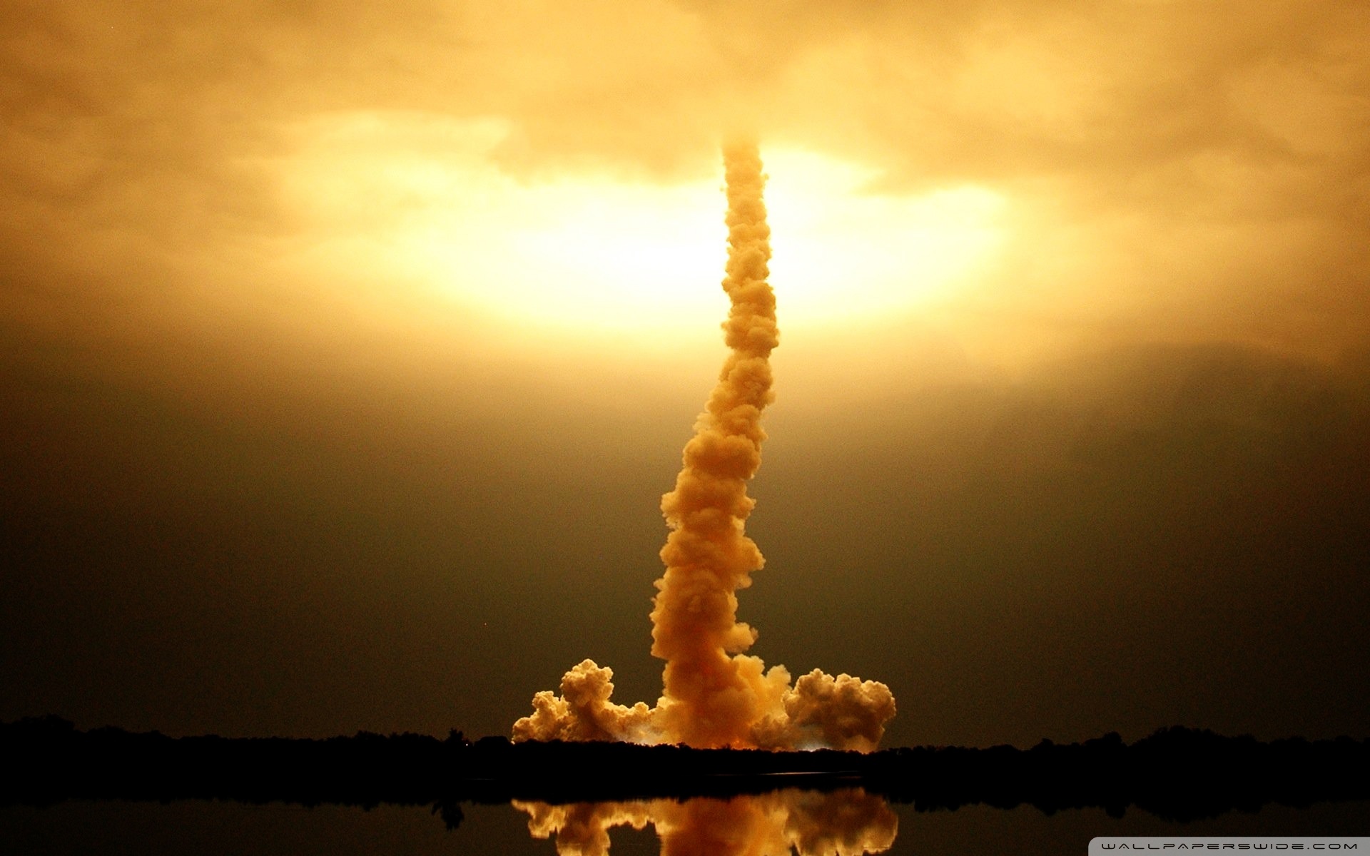 Description: A very tall tower with a lot of smoke coming out of it's sides and a sun in the background.