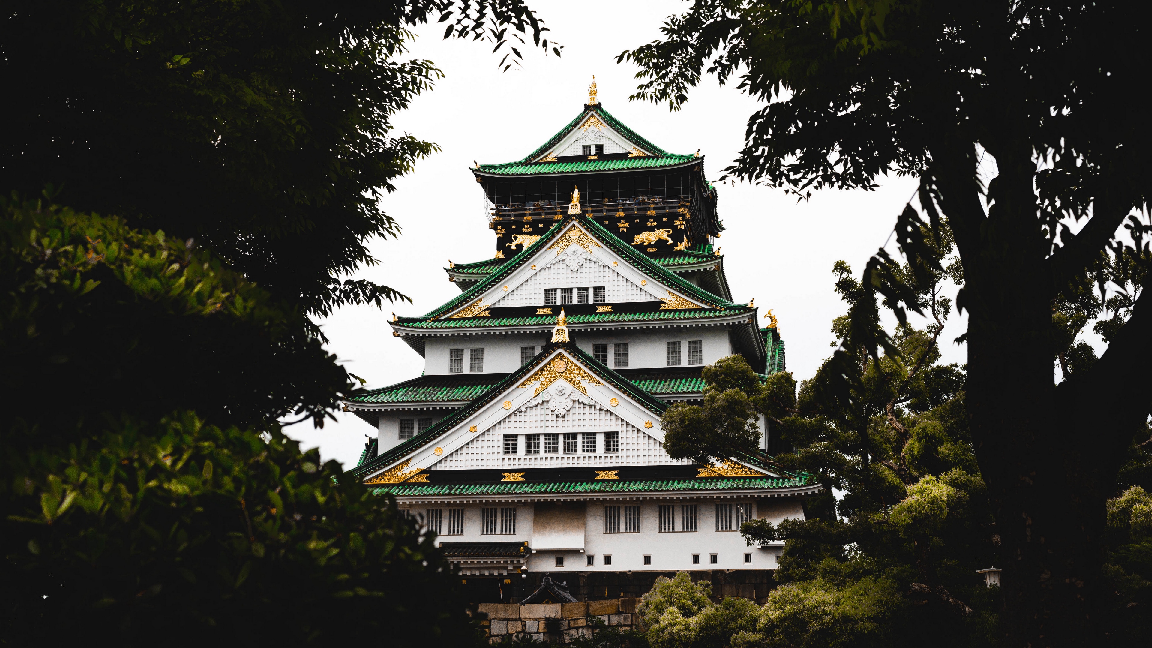 Description: A tall white and green building with a clock on it's side and trees around it's sides.
