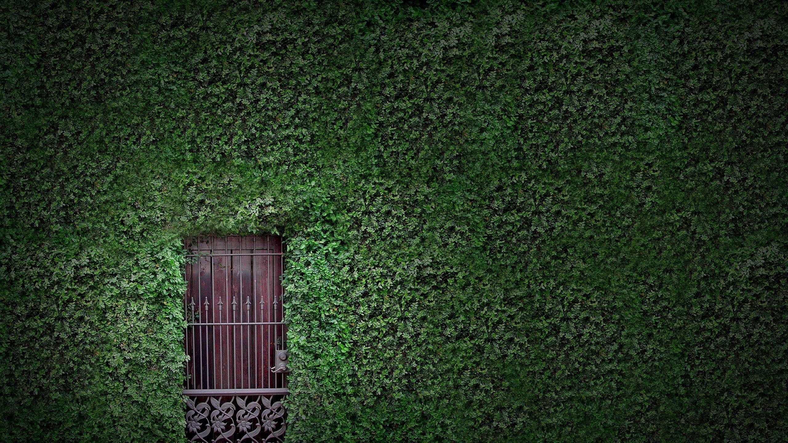 Description: A tall wooden door sitting in the middle of a lush green wall of grass and ivy covered walls behind it.
