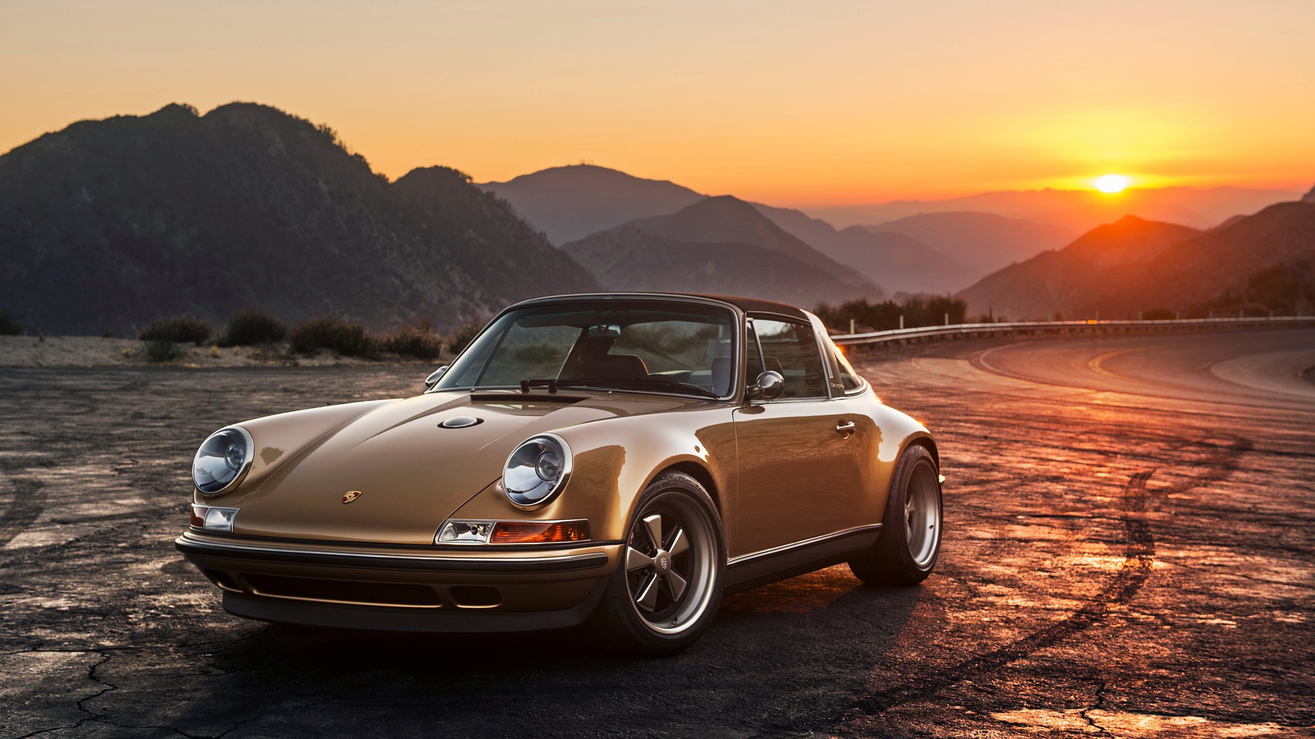 Description: A tan porsche sits on a road with mountains in the background at sunset or dawn in the desert.