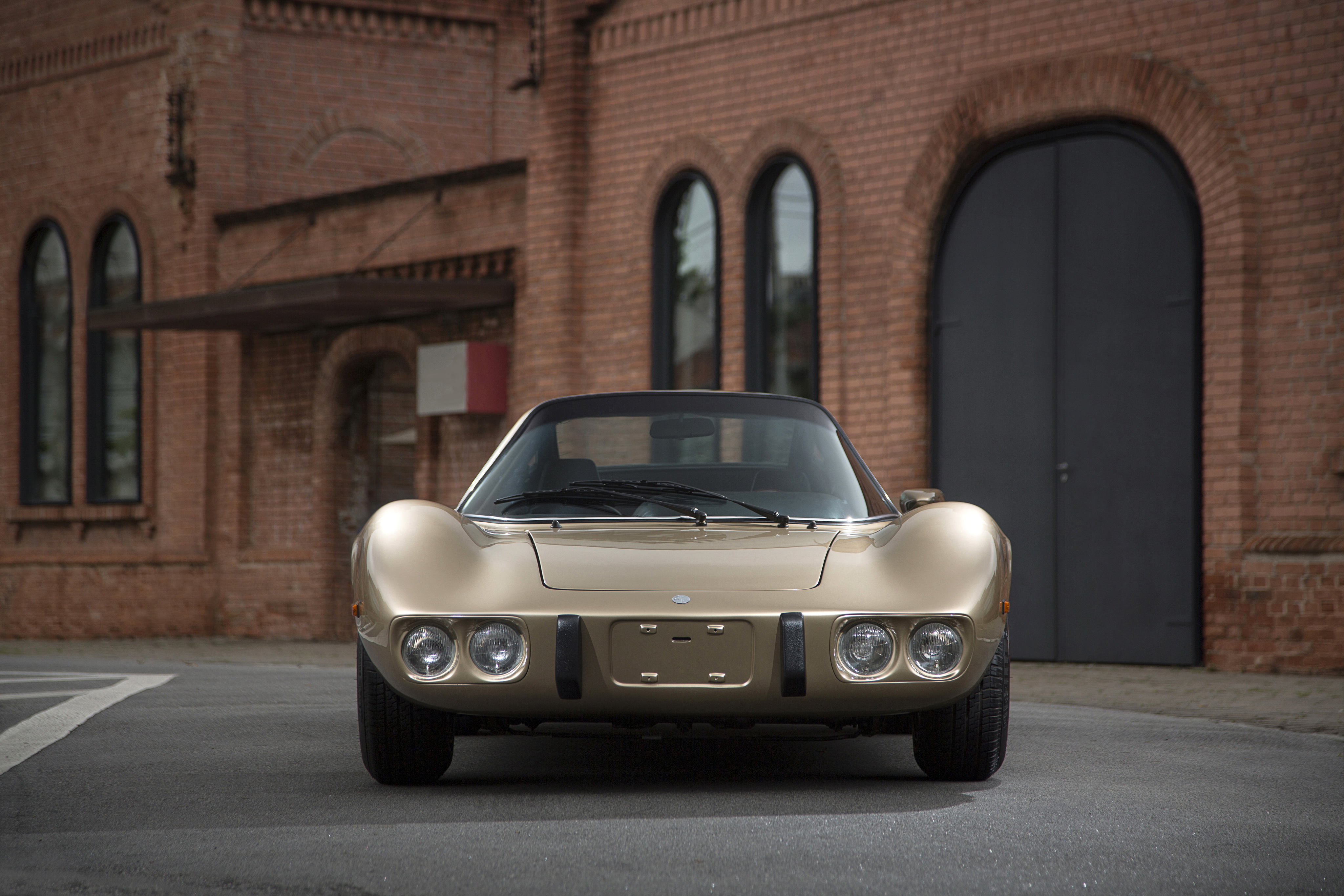 Description: A tan sports car parked in front of a brick building with arched windows and a black door on the side.