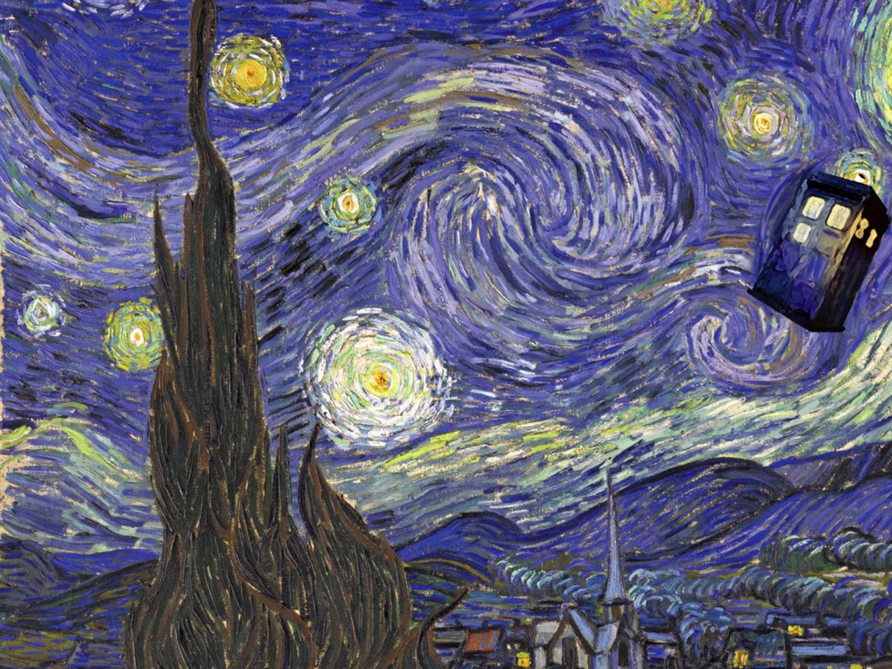 Description: A painting of a tardish flying over a city with stars and a night sky background with a painting of a starry night.