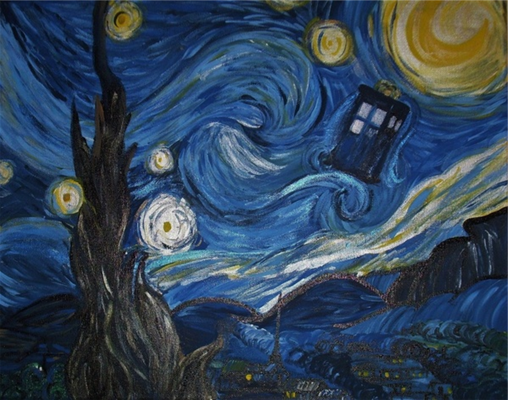 Description: A painting of a tardish and a starry night with a blue sky and stars and a tree.