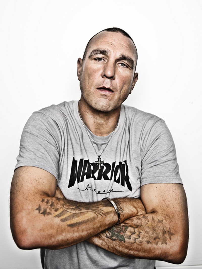 Description: A man with tattoos on his arms and chest posing for a picture with his arms crossed and his eyes closed.