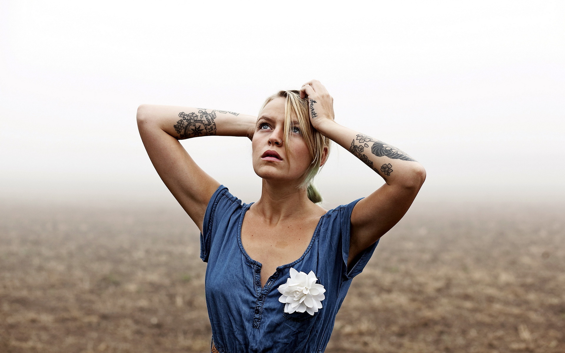 Description: A woman with tattoos on her arms and shoulder stands in a field with her hands on her head and looks up.